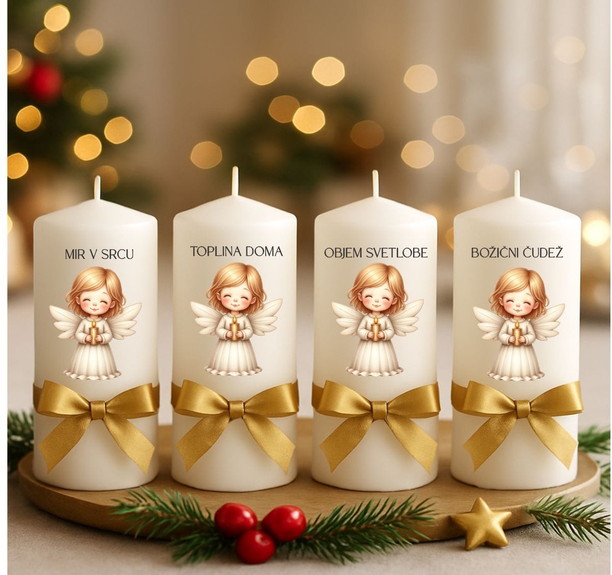 Adventni čas je obdobje topline, svetlobe in prijetnih trenutkov, zato so adventne sveče in božične sveče eden najlepših načinov, da ustvarimo praznično vzdušje v domu. V naši spletni trgovini Poročni Bazar INKI ponujamo čudovite bele dekorativne sveče, ki jih lahko popolnoma personalizirate – z napisi, imeni, datumi ali simboli, kot so angelčki, srčki ali praznični motivi.
