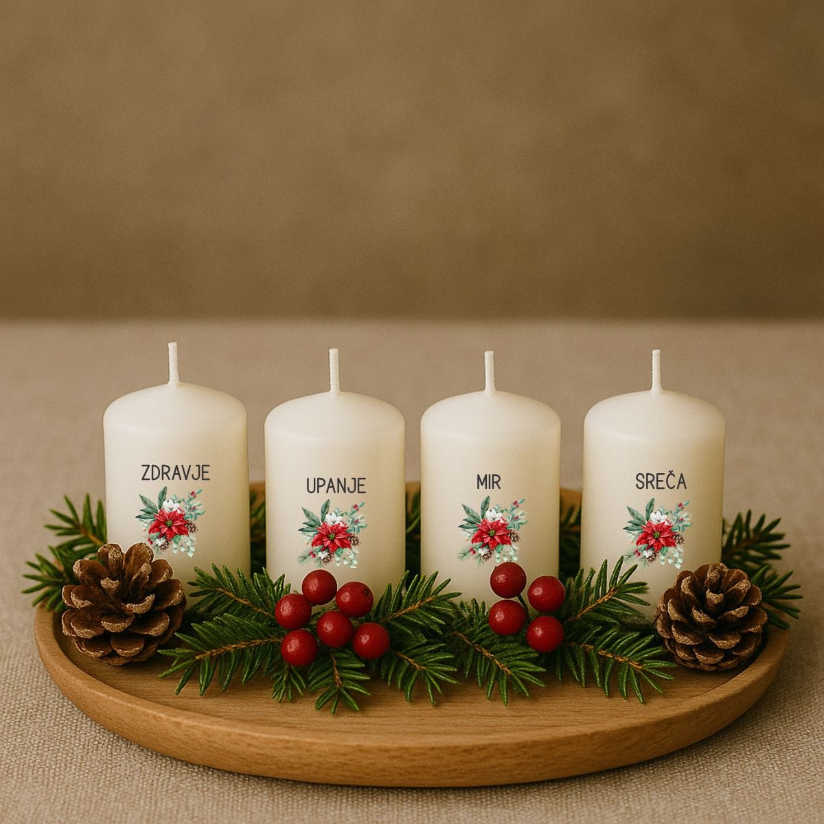 Izbirate lahko med manjšimi adventnimi svečkami ali višjimi dekorativnimi svečami (višina približno 20 cm, premer 8 cm). Vsaka sveča je primerna za personalizacijo, zato jo lahko oplemenitimo z napisi, kot so mir, upanje, ljubezen, radost, ali z motivi angelov, božičnih simbolov in prazničnih sporočil.
