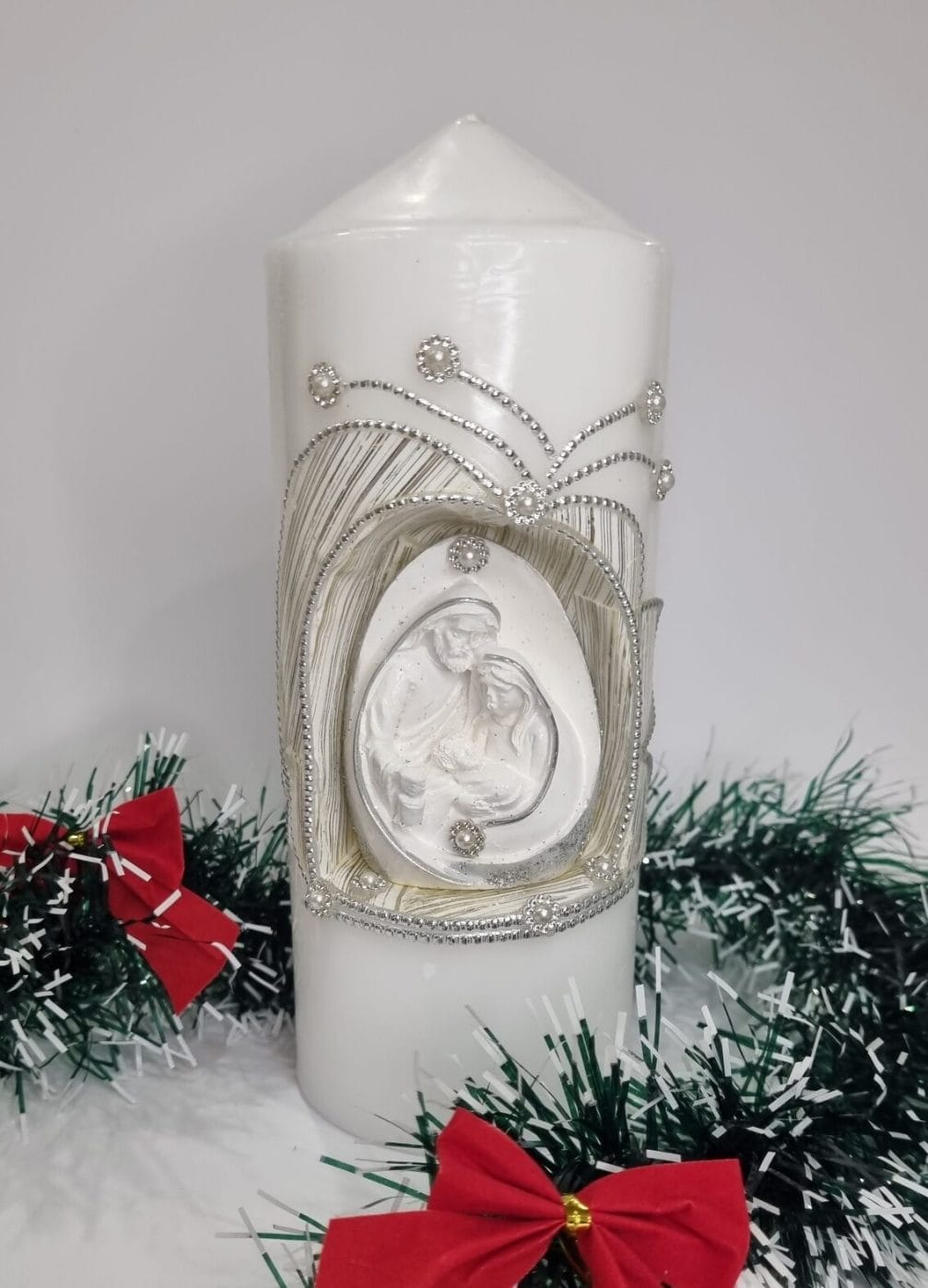 Praznična sveča s keramično figurico Svete družine – ročno izdelana umetnina za vaš dom