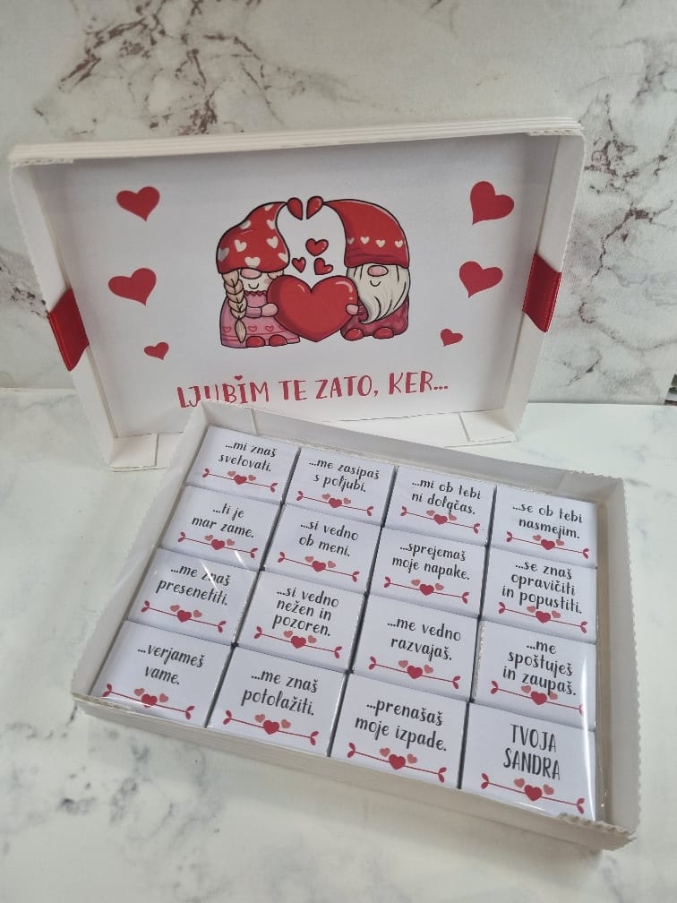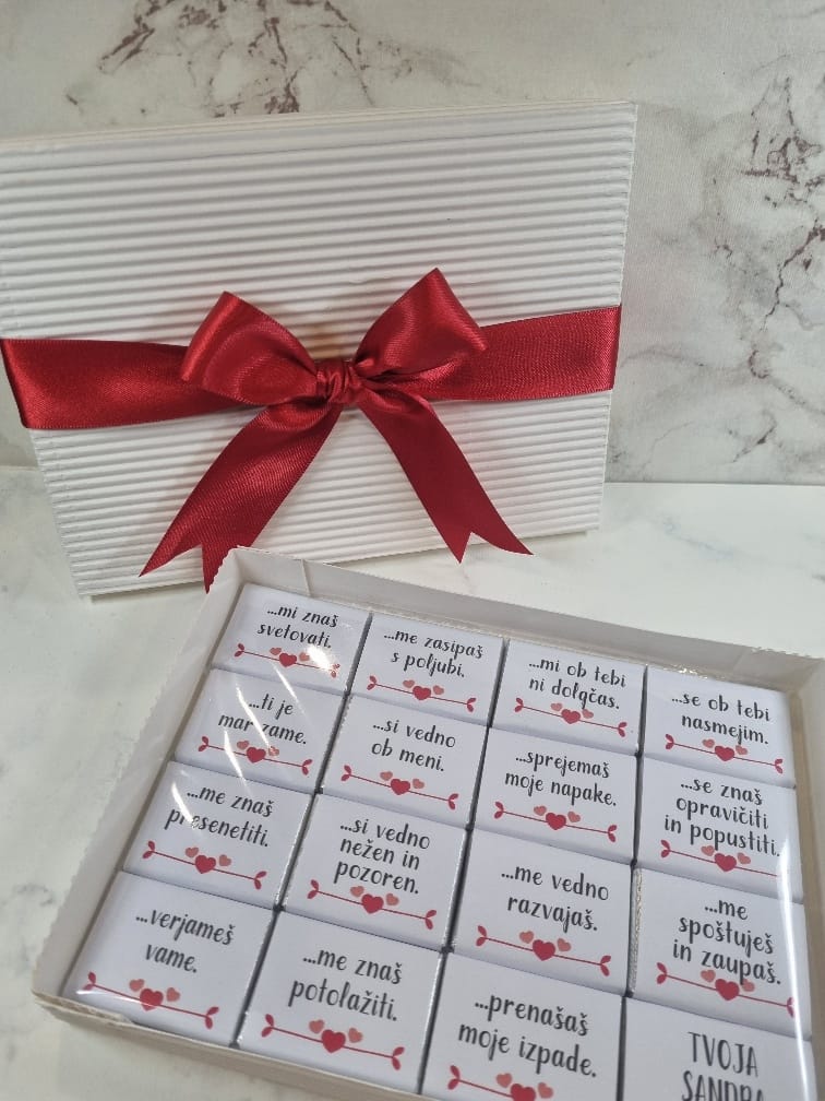 Če iščete darilo s čokoladicami, ki je drugačno, osebno in popolnoma prilagojeno obdarovancu, je naša personalizirana bonboniera s 16 mini čokoladicami popolna izbira. Gre za izdelek, ki združuje sladko pozornost in iskrena sporočila, zato je odlična izbira za obletnico, rojstni dan, valentinovo, božične praznike ali kot presenečenje kar tako – za nekoga, ki vam veliko pomeni.