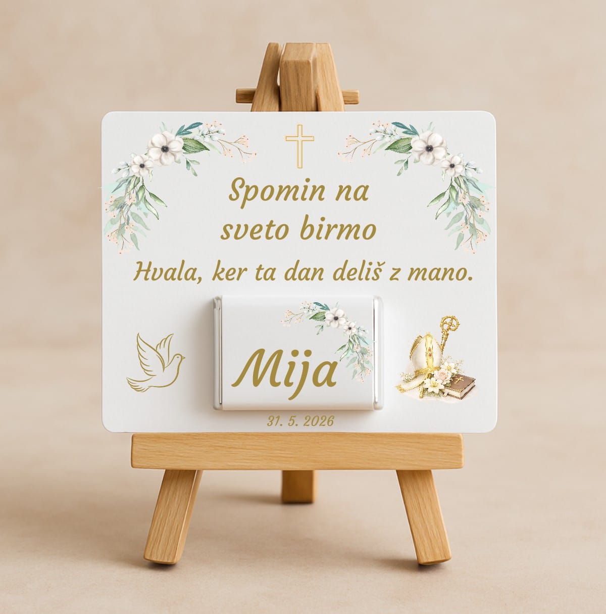 Ta darila za birmo s čokoladico in posvetilom so prav posebno spominsko darilo za birmo.   So lepa pozornost, ki jo birmanci ali njihovi starši pogosto podarijo vsem gostom ob sveti birmi kot zahvalo za prisotnost in lepe želje.