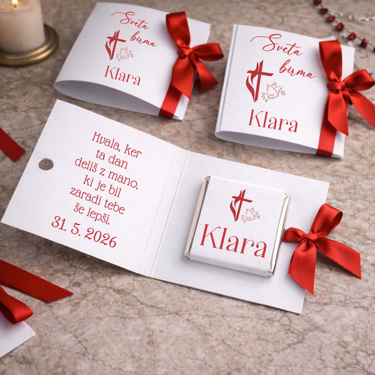Ta darila za birmo s čokoladico in posvetilom so prav posebno spominsko darilo za birmo. So lepa pozornost, ki jo birmanci ali njihovi starši pogosto podarijo vsem gostom ob sveti birmi kot zahvalo za prisotnost in lepe želje.