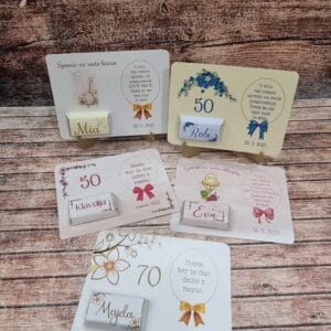 Zelo pogosto so konfeti personalizirane potiskane škatlice. Narejene so iz mat ali perl papirja. Lahko imajo dodane tudi pentjice. V ponudbi so škatlice prazne, lahko pa vam jih napolnimo z bonboni in personaliziranimi čokoladicami – 3 ali 5 kom. V kolikor želite, da vam bonbone ali čokolade dodamo v škatlico, nam to sporočite pod opombe ob naročilu.