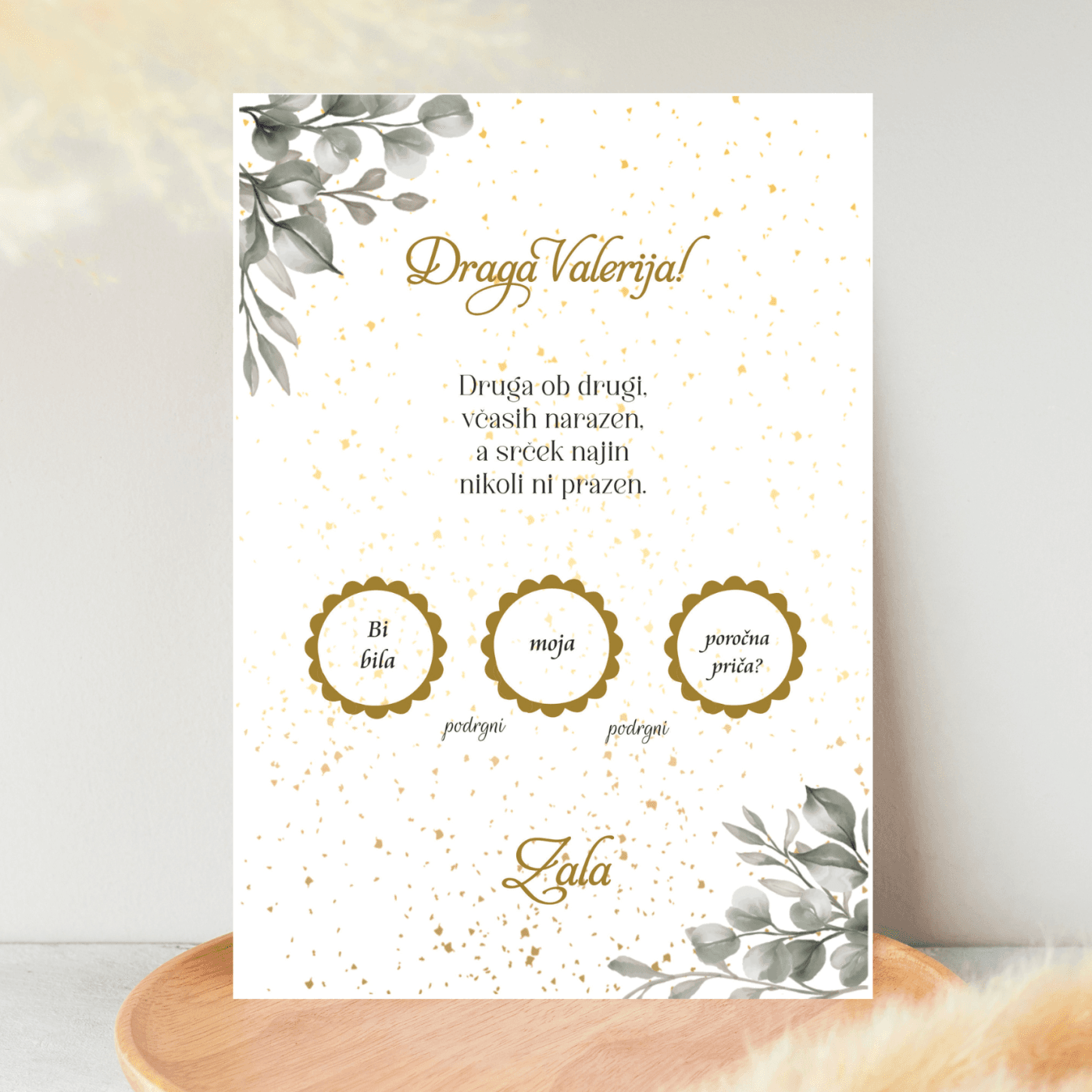 Vstopite v svet nepozabnih trenutkov z našimi karticami presenečenja! Te čarobne kartice so popolna izbira za posebne priložnosti, kot so poroke, krsti in birme. Lahko pa z njimi sporočamo tudi različne pomembne dogodke v življenju. Vsaka kartica je prekrita s posebnim premazom, ki ga lahko spraskate in razkrijete skrivnostno sporočilo. S temi karticami lahko na edinstven način povabite nekoga, da postane vaš krstni ali birmanski boter, ali pa ga prosite, da bi bil vaša poročna priča, družica ali družban. V vsakem odkrivanju se skriva veselje, ki obdarovancu pričara nasmeh na obraz. Ne zamudite priložnosti, da s karticami presenečenja delite to čarobno izkušnjo z najdražjimi!