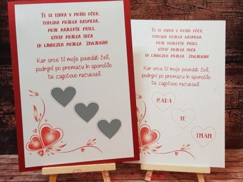 Lahko nam sporočite tudi svoje besedilo in vam bomo osnutek kartice pripravili (doplačilo je 3 eur) in jo posebej za vas natisnili in pripravili.