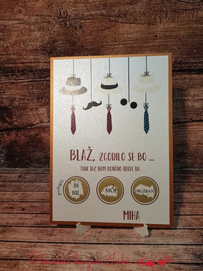 Vstopite v svet nepozabnih trenutkov z našimi karticami presenečenja! Te čarobne kartice so popolna izbira za posebne priložnosti, kot so poroke, krsti in birme. Lahko pa z njimi sporočamo tudi različne pomembne dogodke v življenju. Vsaka kartica je prekrita s posebnim premazom, ki ga lahko spraskate in razkrijete skrivnostno sporočilo. S temi karticami lahko na edinstven način povabite nekoga, da postane vaš krstni ali birmanski boter, ali pa ga prosite, da bi bil vaša poročna priča, družica ali družban. V vsakem odkrivanju se skriva veselje, ki obdarovancu pričara nasmeh na obraz. Ne zamudite priložnosti, da s karticami presenečenja delite to čarobno izkušnjo z najdražjimi!