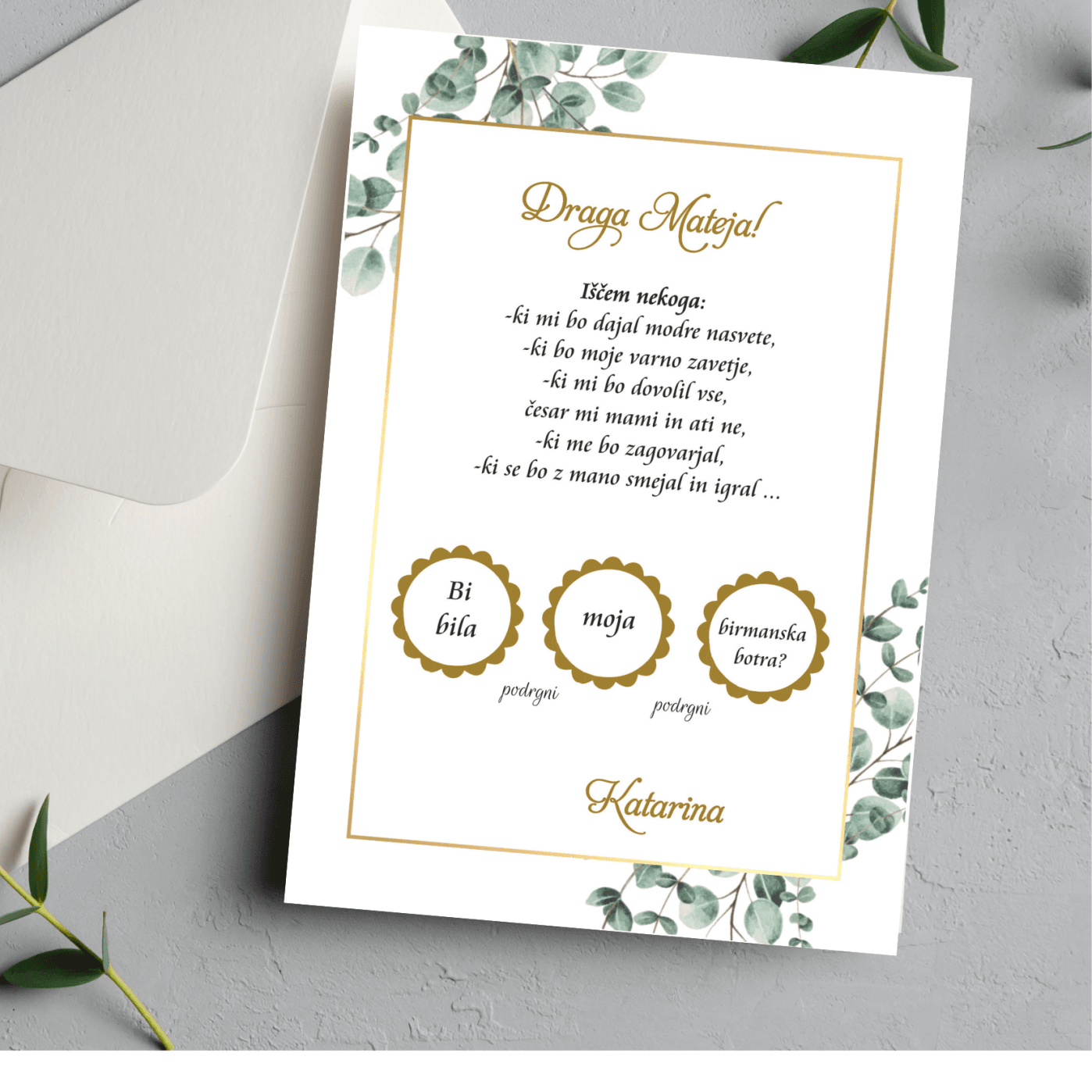 Birma je velik dogodek in vsak birmanec in birmanka potrebujeta birmansko botro ali botra. To je v družini poseben dogodek, ko botra izberemo in postavimo to veliko vprašanje. Da bo ta trenutek malce drugačen, lahko to naredite tudi s pomočjo naše kartice presenečenja birma. Mi jih imenujemo tudi PRASKALKE.  Pomembno je prav vprašanje “Ali bi bila moja krstna botra?” in le to se skriva pod premazom. Kartice presenečenja so različnih oblik in barv, lahko pa vam naredimo tudi kakšne po vaši želji.