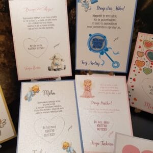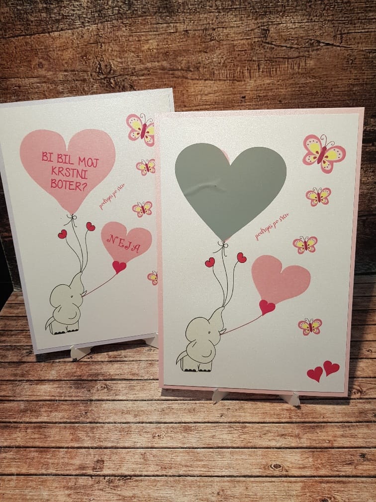 Krst je velik dogodek in vsak krščenec in krščenka potrebujeta krstno botro ali botra. To je v družini poseben dogodek, ko botra izberemo in postavimo to veliko vprašanje. Da bo ta trenutek malce drugačen, lahko to naredite tudi s pomočjo naše kartice presenečenja krst. Mi jih imenujemo tudi PRASKALKE, saj je pomembno prav vprašanje “Ali bi bila moja krstna botra?” in le to se skriva pod premazom. Kartice presenečenja so različnih oblik in barv, lahko pa vam naredimo tudi kakšne po vaši želji. Enostavno in prikupno.