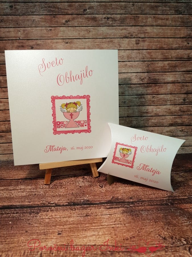 Obhajilo je dogodek, ki ga tisti otroci, ki obiskujejo verouk, z veseljem pričakujejo. To je za njih velik dogodek, saj se zberejo sorodniki in prijatelji. Prav zaradi tega, smo za vas pripravili velik izbor darilca in vabila za obhajilo. Da bo vse v stilu, smo za vas pripravili komplet za obhajilo, ki ga sestavlja vabilo in darilna škatlica. Škatlice so prazne, tako, da lahko v njih sami kaj zapakirate, lahko pa vam na vašo željo, damo v škatlice karkoli tudi mi (ob doplačilu).