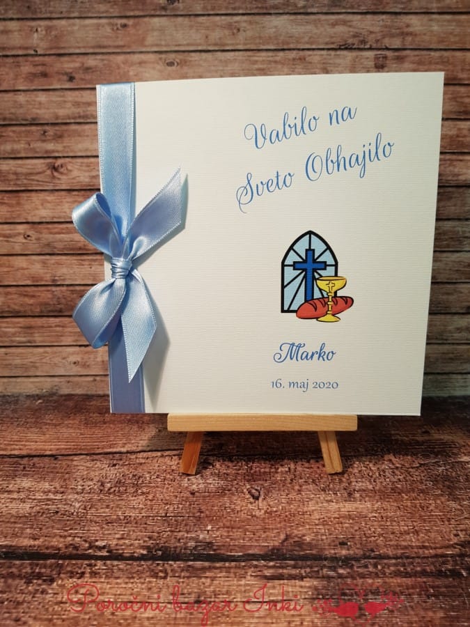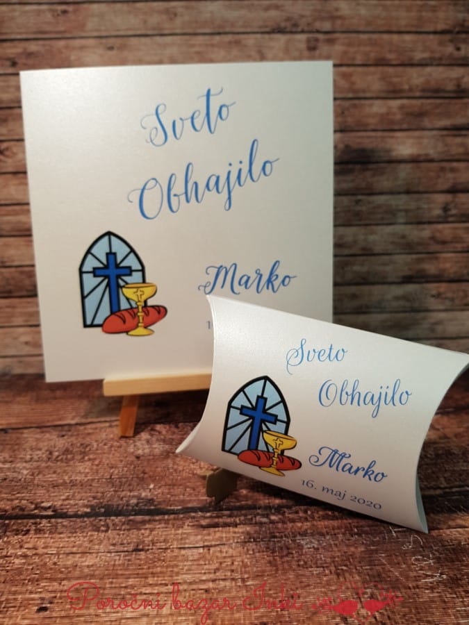V naši ponudbi izdelkov za obhajilo, vam ponujamo komplet za obhajilo, prav tako pa lahko naročite izdelke posamično, vendar je pri tem cena nekoliko višja. Ponudbo naših vabil za obhajilo, darilc za obhajilo si lahko ogledate na naši SPLETNI TRGOVINI, veliko izdelkov je objavljenih tudi na INSTAGRAM PROFILU, vse novosti pa vam dnevno prikazujemo na naši FACEBOOK strani. Tudi na naši PINTEREST strani, lahko najdete naše izdelke. Vabimo vas, da si vse dobro pogledate in veseli bomo, če se odločite za naročilo. Za vsa vprašanja smo vam na voljo na naši email naslovu info@porocni-bazar.si lahko pa nas tudi pokličete na 041 557 613.