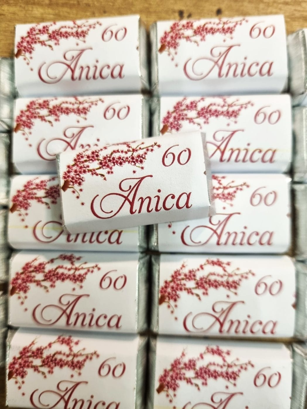 Vsaka čokoladica je ovita v kakovosten, personaliziran ovitek po vaših željah – z imenom, datumom, motivom ali logotipom podjetja.