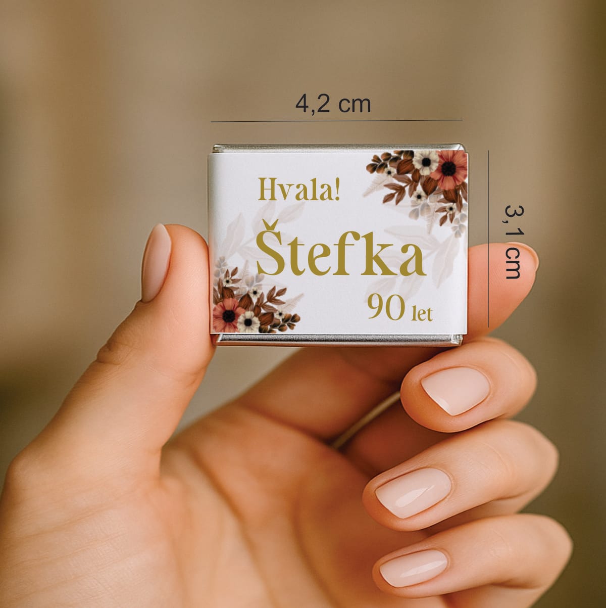 Vsaka čokoladica je ovita v kakovosten, personaliziran ovitek po vaših željah – z imenom, datumom, motivom ali logotipom podjetja.