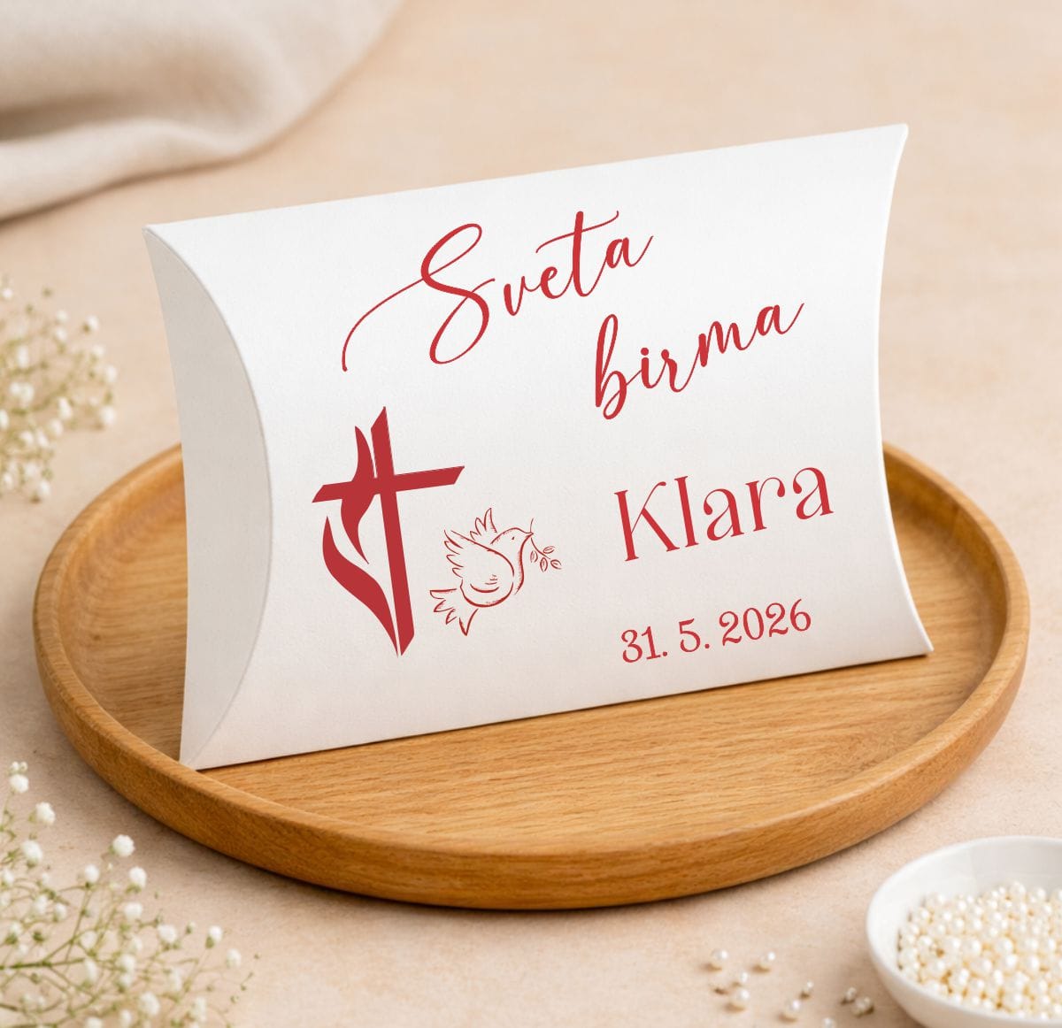 Te birmanske škatlice so oblikovane v nežnem, svečanem slogu in personalizirane z imenom birmanca ali birmanke ter datumom svete birme. Zaradi svoje oblike in videza delujejo kot lepo spominsko darilo za birmo, ki ostane v spomin še dolgo po praznovanju.