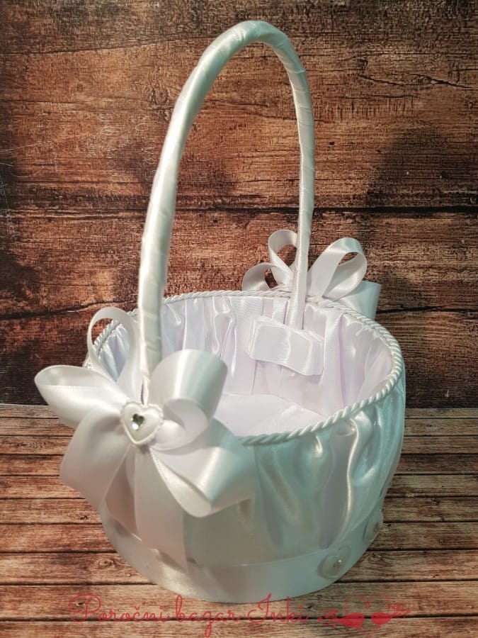 Poročne košarice za cvetje  za cvetne lističe so narejene iz satena z najrazličnejšimi dodatki – trakovi, kamenčki, rožice… Košarice so ovalne ali okrogle. Pri nekaterih modelih je možno spremeniti barvne kombinacije (pošljite povpraševanje). Naše košarice za cvetje so ročno izdelane in unikatne, saj je praktično vsaka košarica drugačna. Materiali so lahki in ne dodajo teže košarici. Košarice so primerne za svileno cvetje in papirne konfete in ne za težje predmete, saj ne bi prenesle velike teže (niso za večje količine riža ali konfete – bonbone)