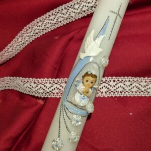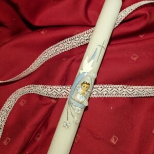 Krstna sveča je del svetega krsta in se uporabi v kombinaciji s krstnim prtom – prtičkom, ki vam jih prav tako ponujamo v naši ponudbi. Pester izbor prtičkov, si lahko ogledate na tej povezavi TUKAJ