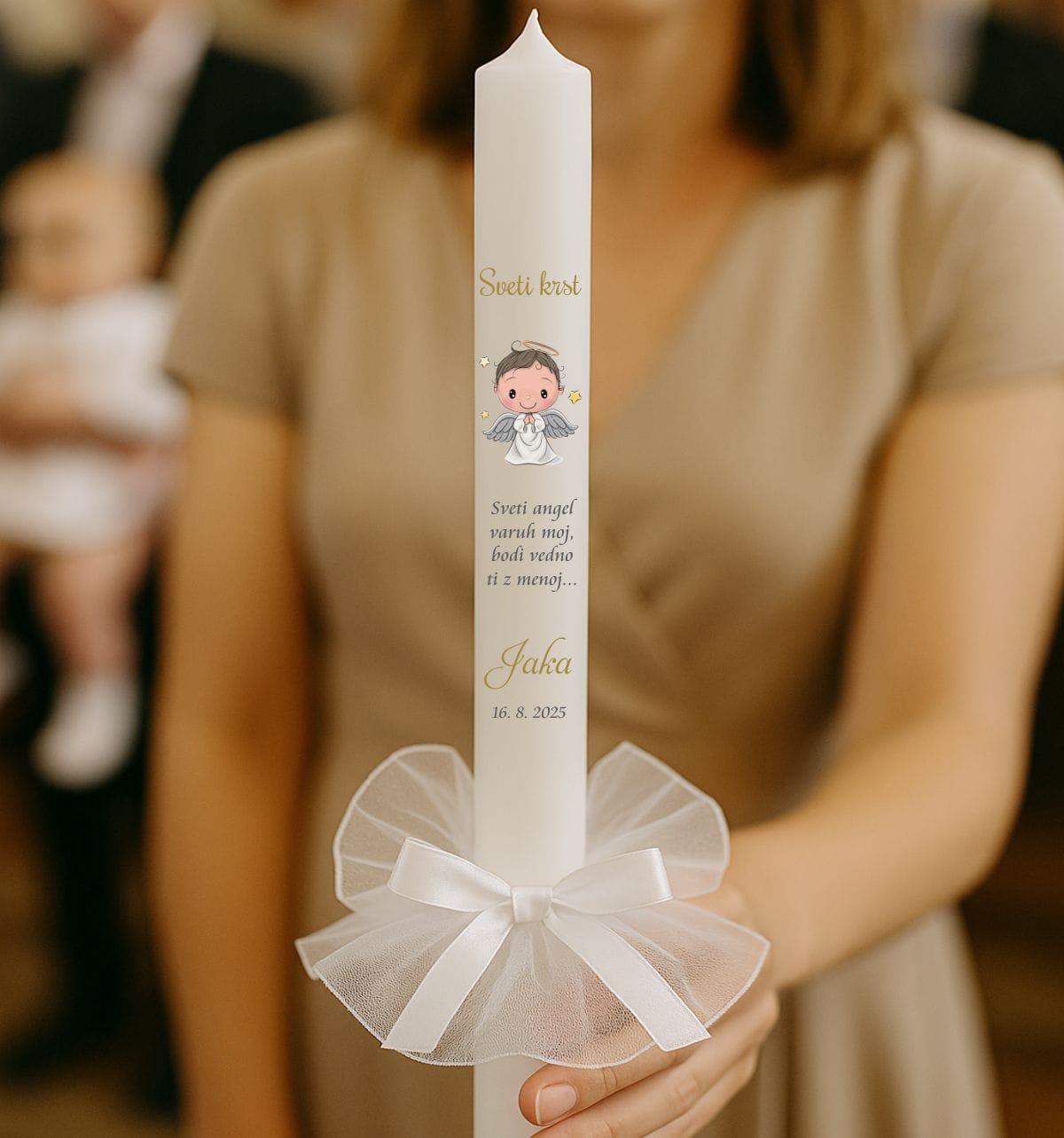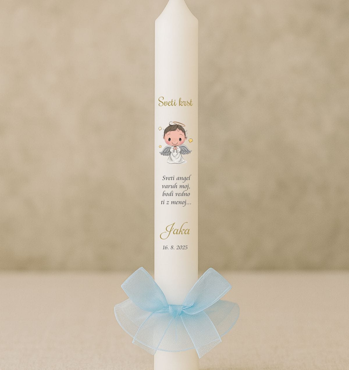 Lep dodatek ob krstni slovesnosti so krstne sveče. Krstne sveče z angelčkom in pentljo so lahko ozke in daljše, lahko pa so tudi krajše in debelejše. V naši ponudbi imamo kratke in dolge sveče. Ob svečah vam ponujamo tudi krstne prtičke, ki si jih lahko ogledate v naši spletni trgovini , za ogled kliknite TUKAJ