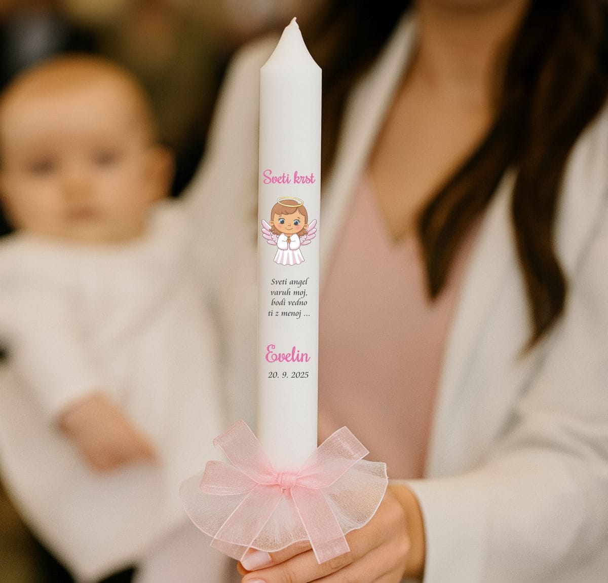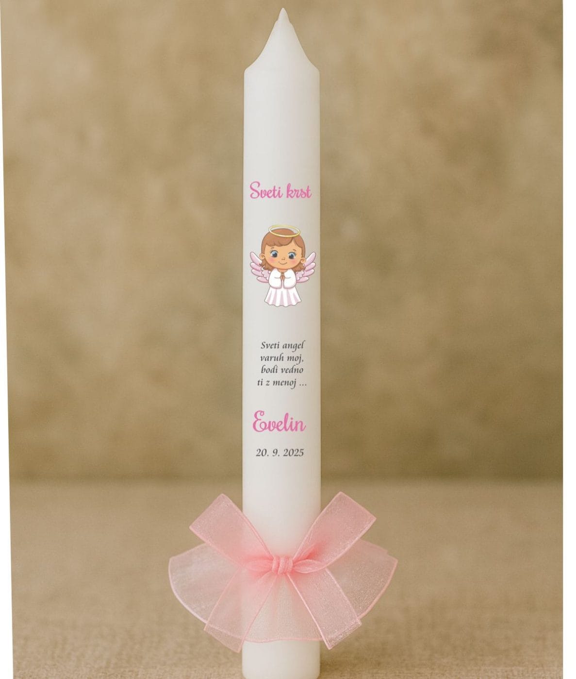 Lep dodatek ob krstni slovesnosti so krstne sveče. Krstne sveče z angelčkom in pentljo so lahko ozke in daljše, lahko pa so tudi krajše in debelejše. V naši ponudbi imamo kratke in dolge sveče. Ob svečah vam ponujamo tudi krstne prtičke, ki si jih lahko ogledate v naši spletni trgovini , za ogled kliknite TUKAJ