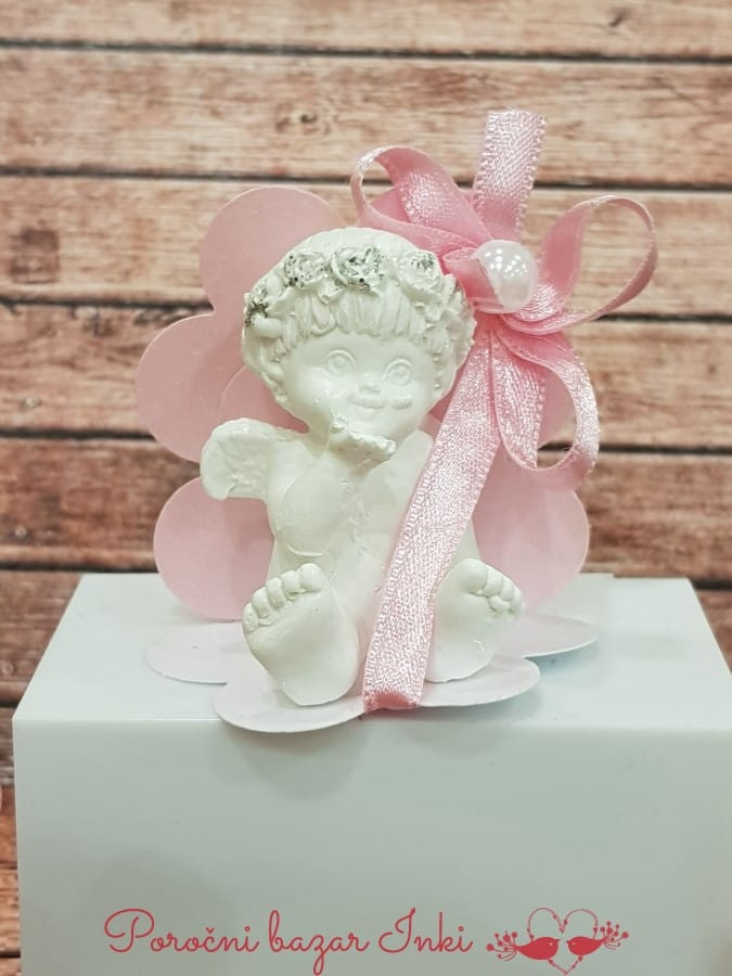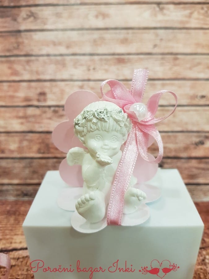 Krstni konfet je angel v škatlici. Notranjost – trak in dekoracija – barva, se lahko spremeni. Velikost škatlice ja cca 6×6 cm, angelček je visok cca 5 cm.