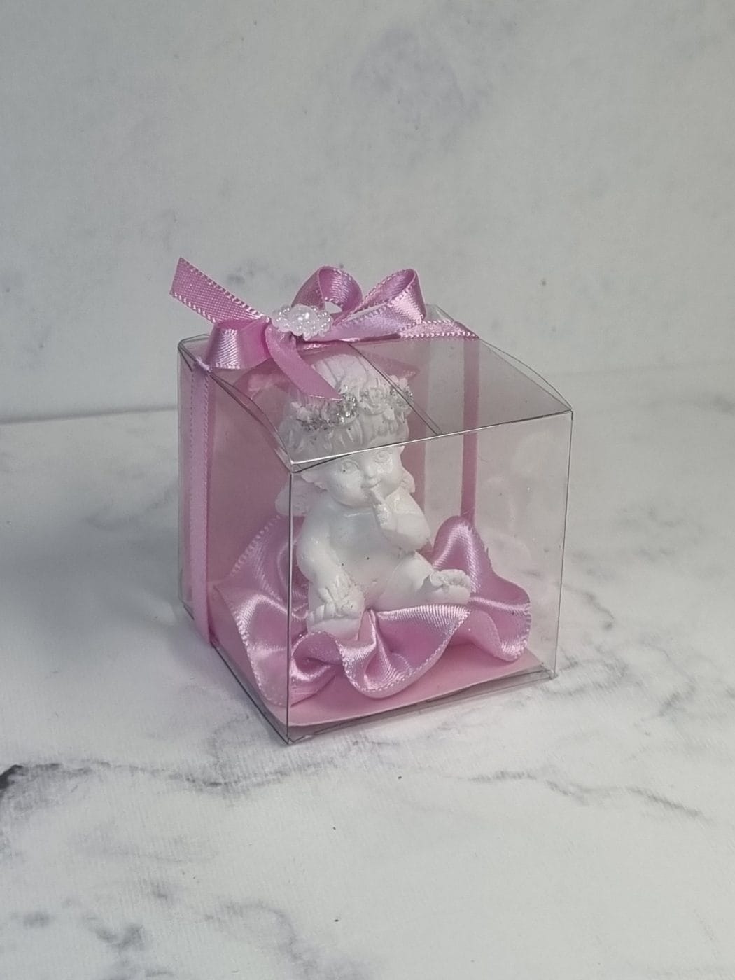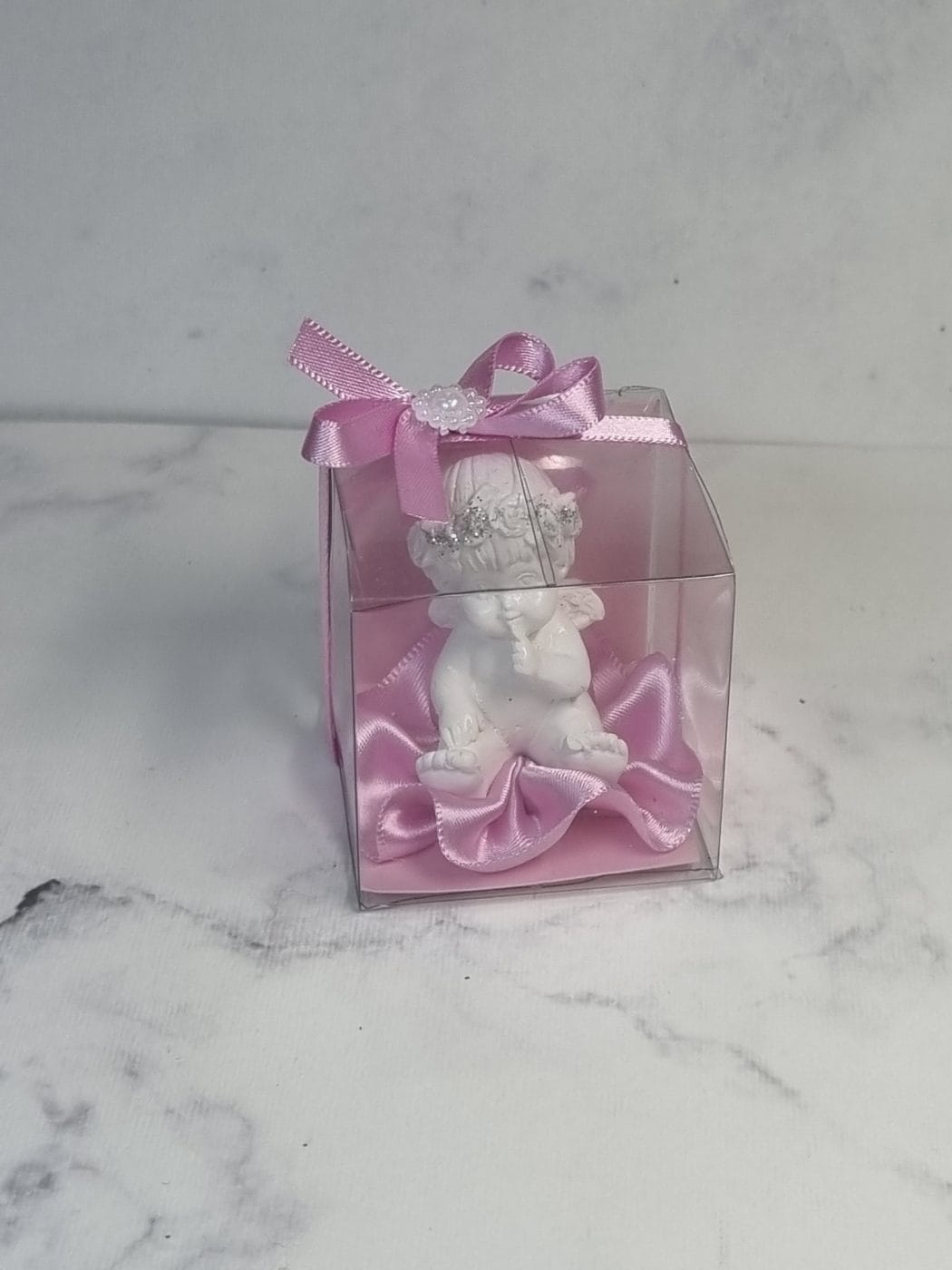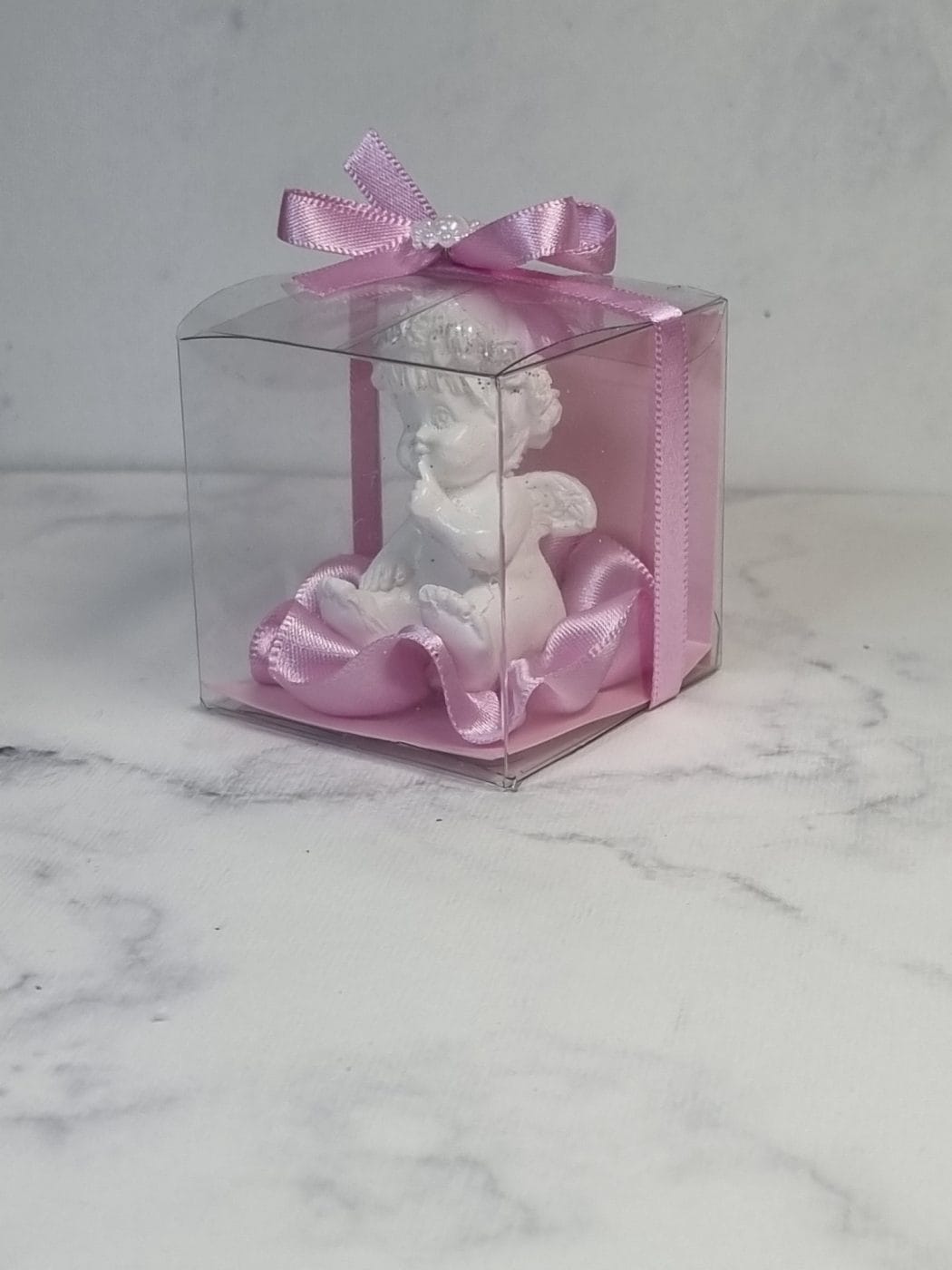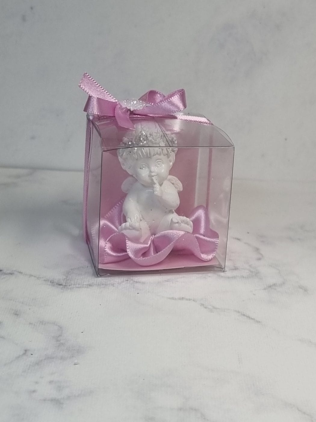 Krstni angelček v škatlici je običajno nameščen v lično darilno embalažo, pogosto dopolnjeno s pentljico ali dekorativnim trakom. Takšna oblika je zelo priljubljena kot darilce za goste ob krstu, saj deluje elegantno in hkrati zaščiti figurico.