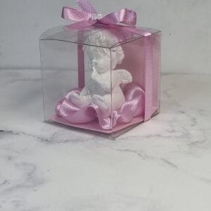 Krstni konfet je angel v škatlici. Notranjost – trak in dekoracija – barva, se lahko spremeni. Velikost škatlice ja cca 6×6 cm, angelček je visok cca 5 cm.