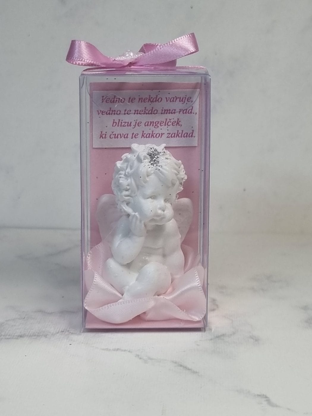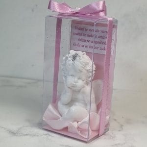 Krstni konfet je angel v škatlici. Notranjost – trak in dekoracija – barva, se lahko spremeni. Velikost škatlice ja cca 6×6 cm, angelček je visok cca 5 cm.