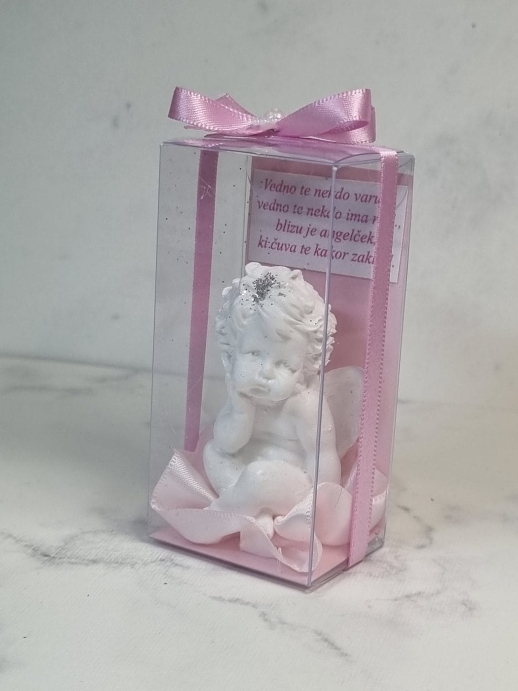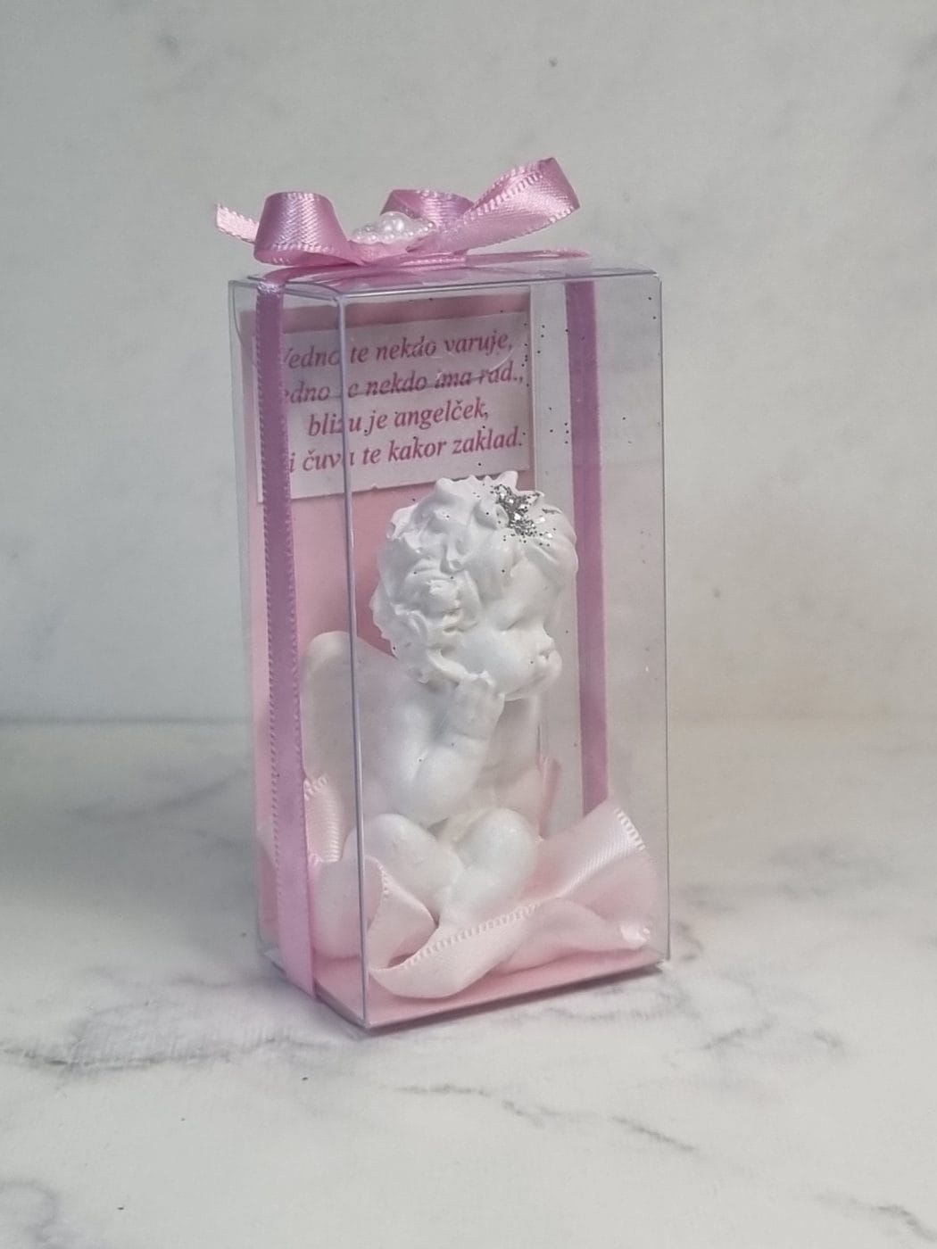 Krstni angelček v škatlici je običajno nameščen v lično darilno embalažo, pogosto dopolnjeno s pentljico ali dekorativnim trakom. Takšna oblika je zelo priljubljena kot darilce za goste ob krstu, saj deluje elegantno in hkrati zaščiti figurico.
