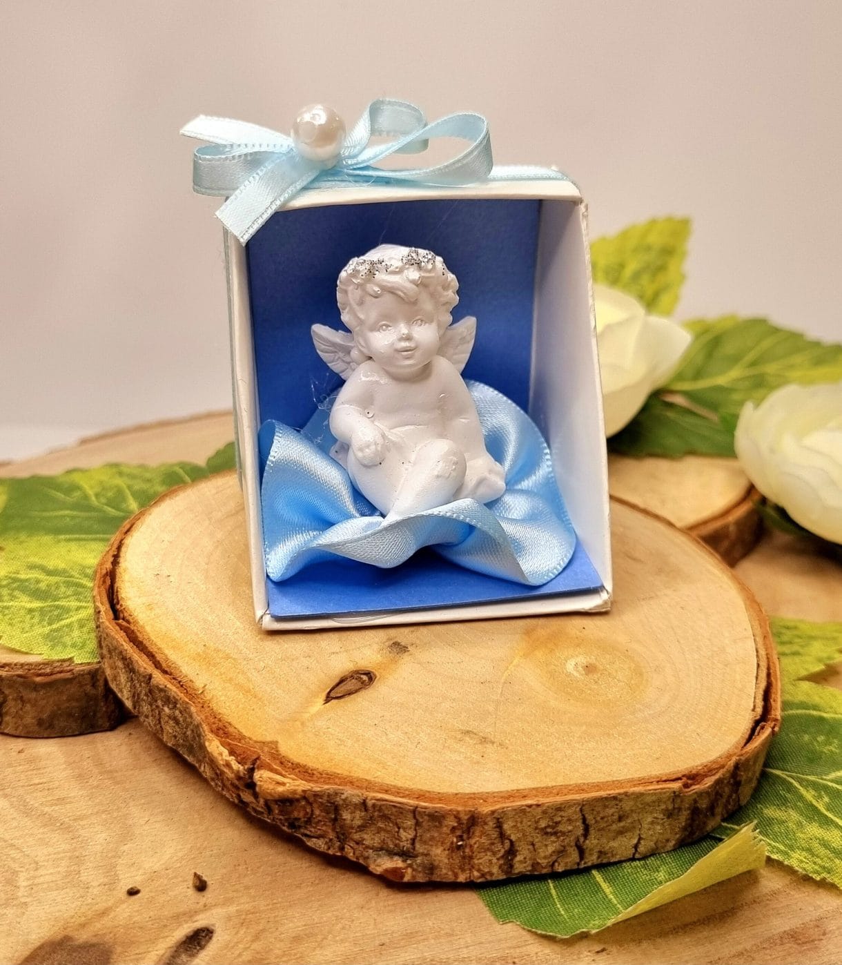 Krstni angelček v škatlici je običajno nameščen v lično darilno embalažo, pogosto dopolnjeno s pentljico ali dekorativnim trakom. Takšna oblika je zelo priljubljena kot darilce za goste ob krstu, saj deluje elegantno in hkrati zaščiti figurico.