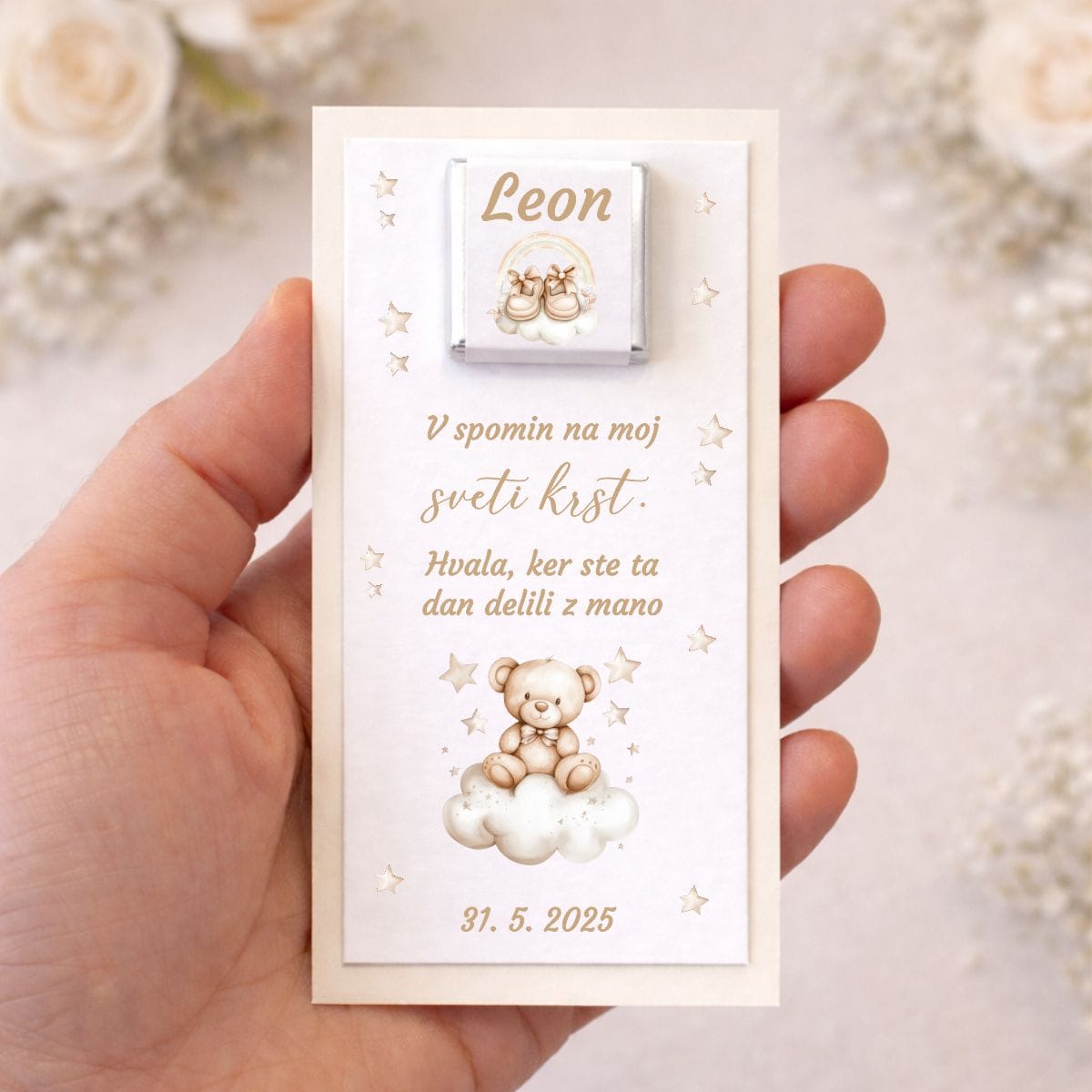 Poleg krstnih darilc in krstnih čokoladic vam ponujamo tudi bogato izbiro drugih izdelkov za sveti krst, kot so krstne sveče, prtički in krstna vabila. Celotna ponudba omogoča, da slavje oblikujete usklajeno, nežno in z osebno noto.