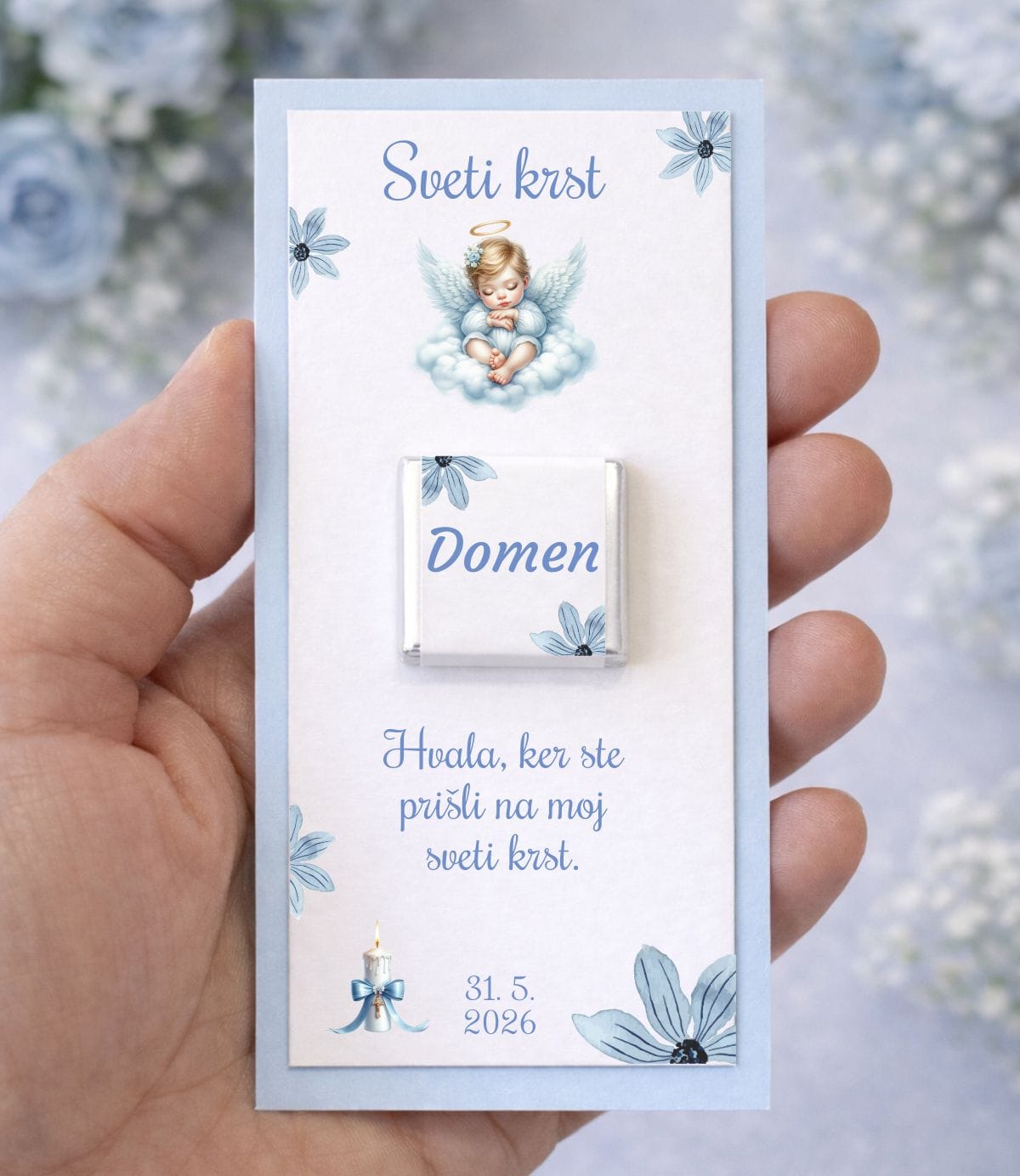 Poleg krstnih darilc in krstnih čokoladic vam ponujamo tudi bogato izbiro drugih izdelkov za sveti krst, kot so krstne sveče, prtički in krstna vabila. Celotna ponudba omogoča, da slavje oblikujete usklajeno, nežno in z osebno noto.
