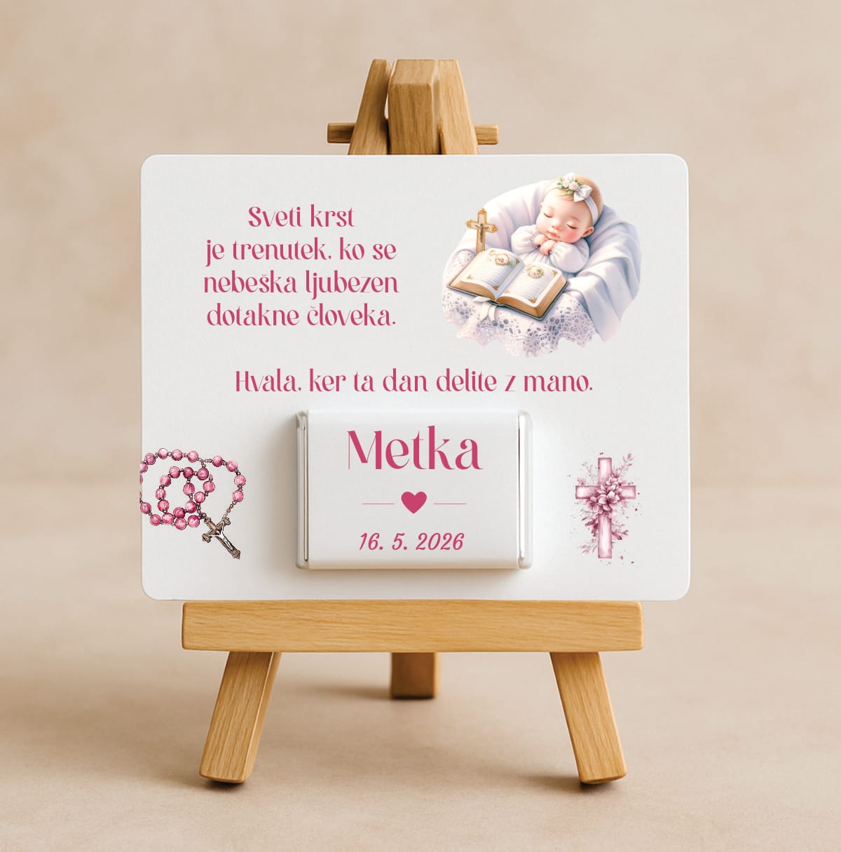 Poleg krstnih darilc in krstnih čokoladic vam ponujamo tudi bogato izbiro drugih izdelkov za sveti krst, kot so krstne sveče, prtički in krstna vabila. Celotna ponudba omogoča, da slavje oblikujete usklajeno, nežno in z osebno noto.