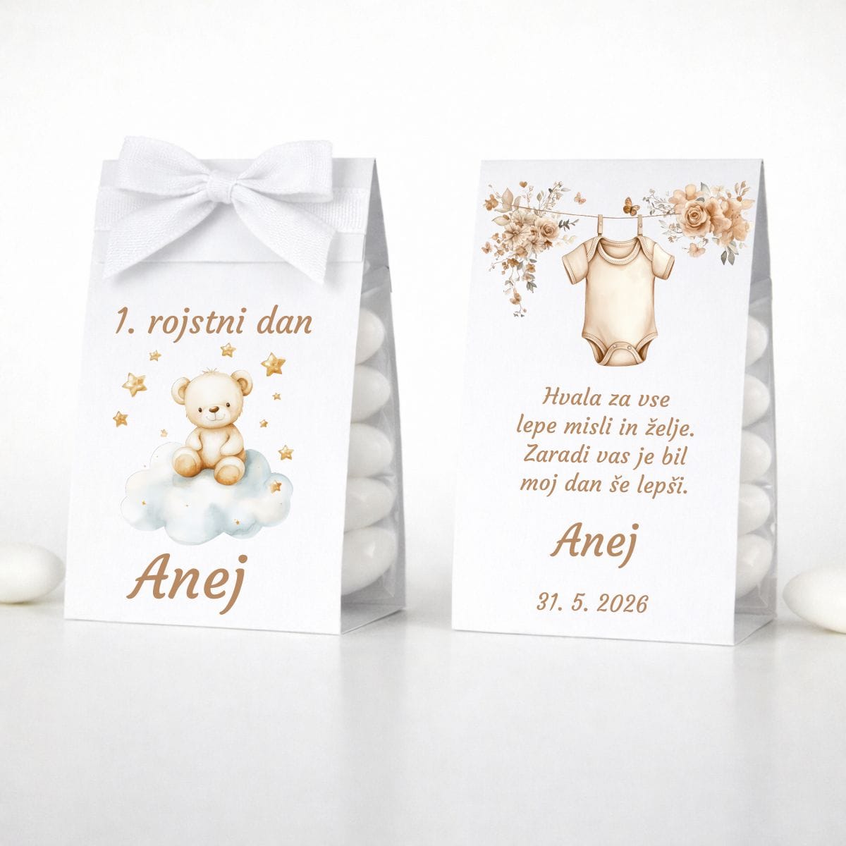 Naši krstni konfeti z mandlji so pripravljeni v lični škatlici, ki je ob strani odprta in omogoča pogled na vsebino. Škatlica je velika približno 6 × 9 cm in je dopolnjena z nežno pentljico na vrhu. Sprednja stran je namenjena motivu in imenu otroka, na zadnji strani pa je lahko zahvala ali kratko posvetilo, zaradi česar konfeti dobijo osebno noto.