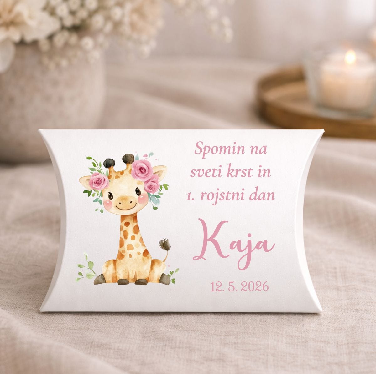 Ko izberete darilca za krst, izdelek dodajte v košarico in izberite želeno količino. V opombe ob naročilu zapišite ime otroka, datum krsta ter želeno vsebino škatlic (prazne, mandlji ali personalizirane čokoladice). Po potrebi je možna tudi barvna prilagoditev.