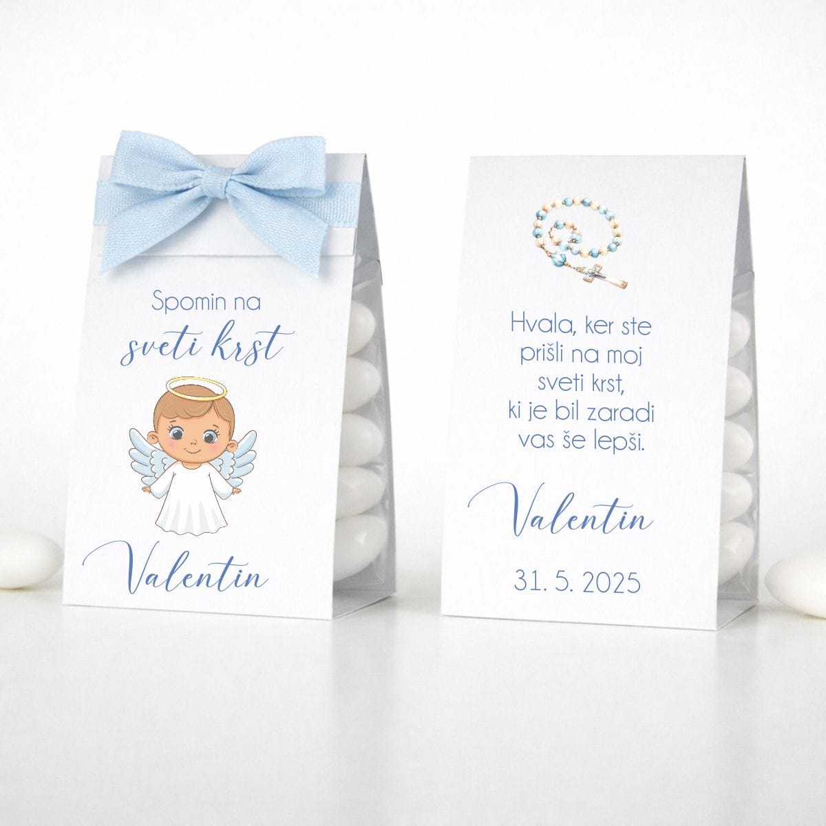Naši krstni konfeti z mandlji so pripravljeni v lični škatlici, ki je ob strani odprta in omogoča pogled na vsebino. Škatlica je velika približno 6 × 9 cm in je dopolnjena z nežno pentljico na vrhu. Sprednja stran je namenjena motivu in imenu otroka, na zadnji strani pa je lahko zahvala ali kratko posvetilo, zaradi česar konfeti dobijo osebno noto.