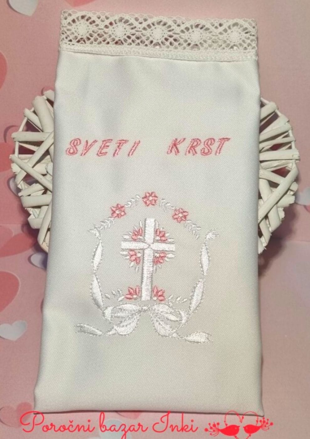 Prtiček je bele barve in take barve je tudi čipka. Velikost prtička je cca 30×30 cm. Na prtičku je izvezen krstni motiv, napis sveti krst in na dnu je izvezeno tudi ime in datum krsta. Barve vezenja so bela, roza, sv. modra in krem. Posebej atraktivni so prtički, ki so dvobarvni in je osnova bela in so le detajli izšiti v roza, krem ali modri barvi. Preostale modele, si lahko ogledate TUKAJ