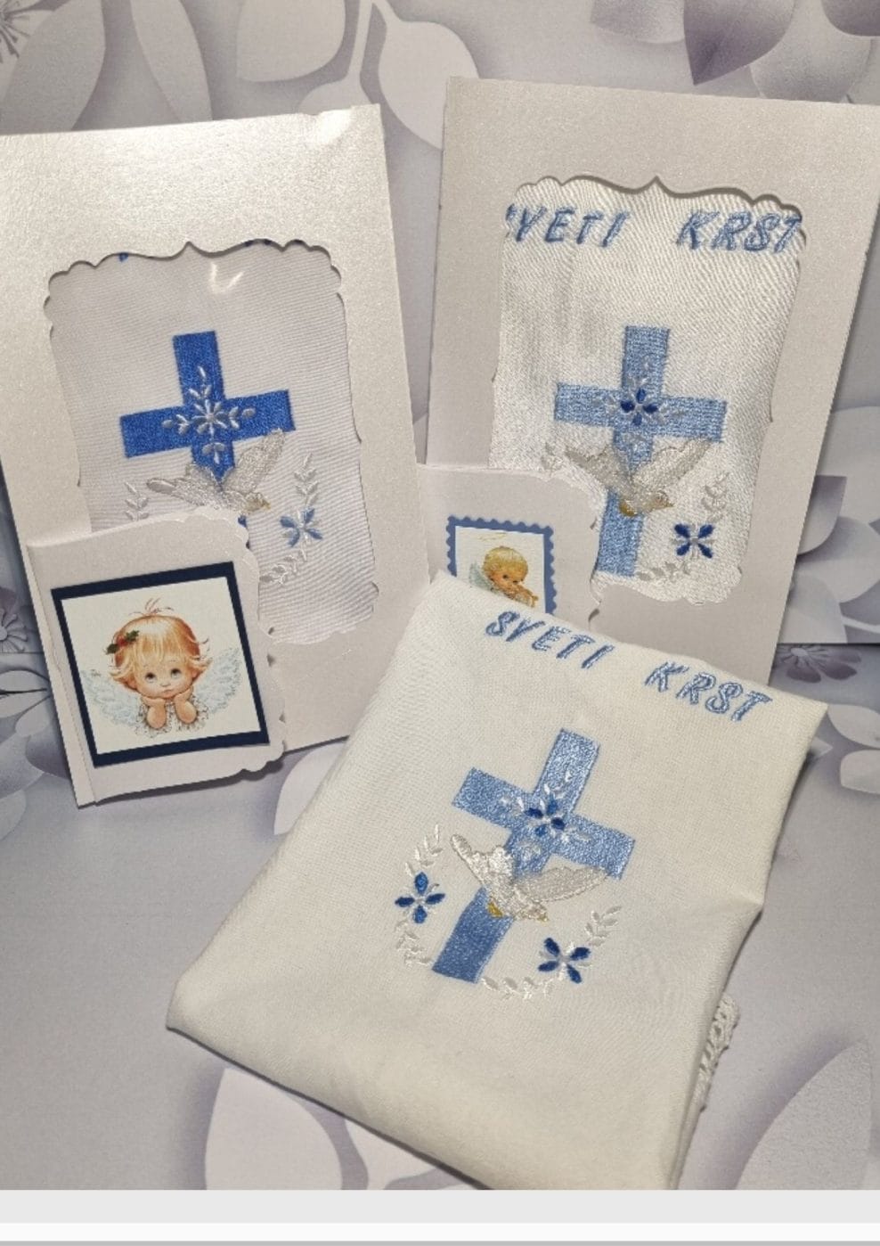 V naši ponudbi si oglejte prtičke in si ga izberite, dajte izdelek v košarico. Pod opombe napišite ime krščenca-ke in datum krsta. Prtiček je tudi v lični škatli.
