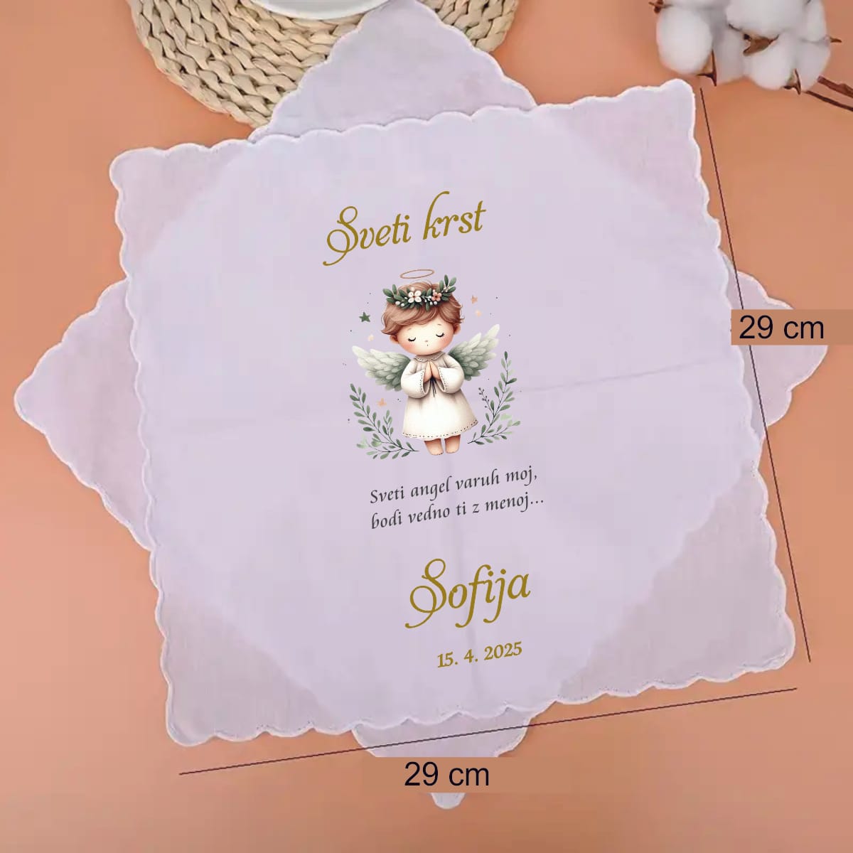Prtiček z angelčkom je bele barve in take barve je tudi čipka. Velikost prtička je cca 30×30 cm. Na prtičku je izvezen krstni motiv, napis sveti krst in na dnu je izvezeno tudi ime in datum krsta. Barve vezenja so bela, roza, sv. modra in krem. Posebej atraktivni so prtički, ki so dvobarvni in je osnova bela in so le detajli izšiti v roza, krem ali modri barvi. Preostale modele, si lahko ogledate TUKAJ