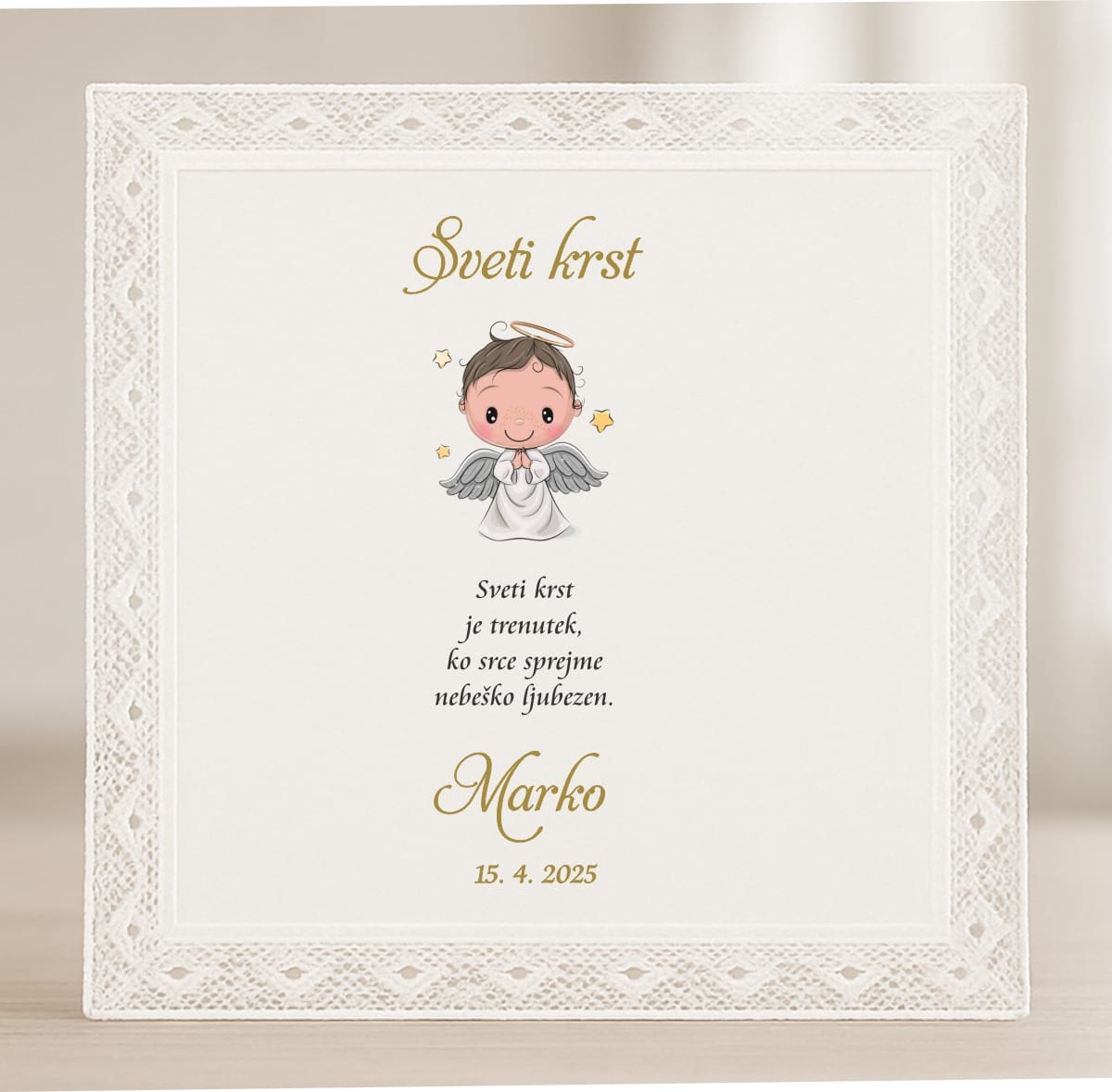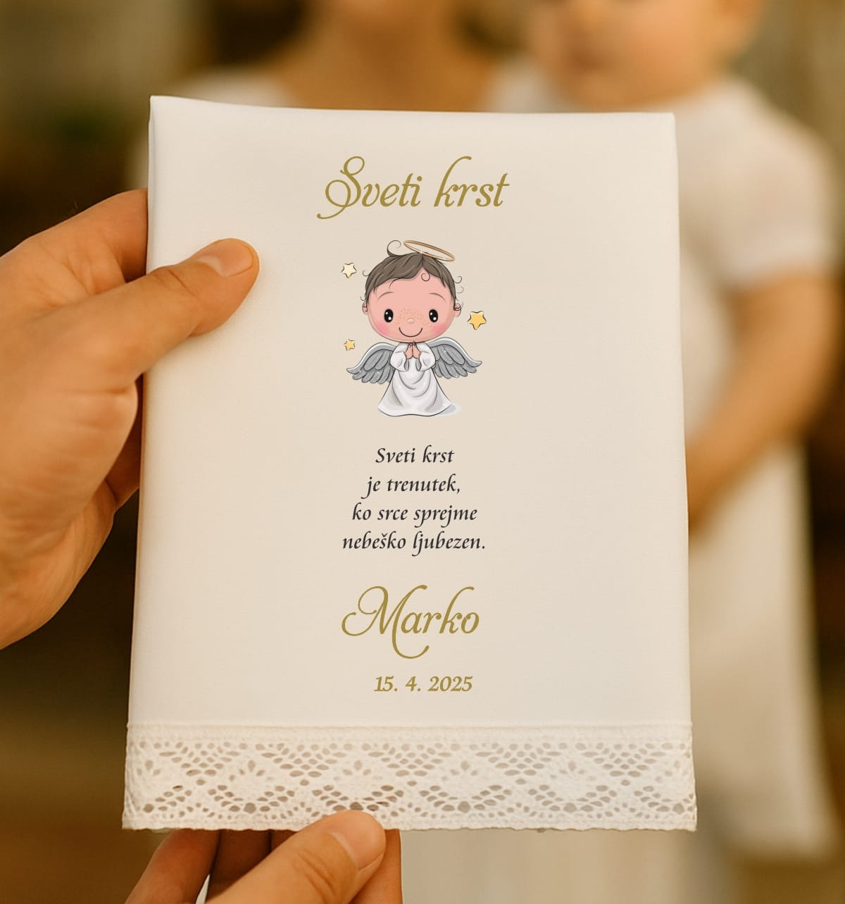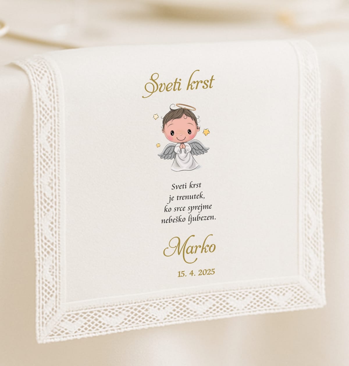 V naši ponudbi si oglejte prtičke in si ga izberite, dajte izdelek v košarico. Pod opombe napišite ime krščenca-ke in datum krsta. Prtiček je tudi v lični škatli.