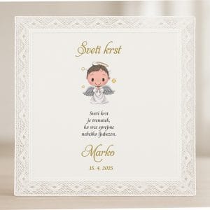 Prtiček z angelčkom je bele barve in take barve je tudi čipka. Velikost prtička je cca 30×30 cm. Na prtičku je izvezen krstni motiv, napis sveti krst in na dnu je izvezeno tudi ime in datum krsta. Barve vezenja so bela, roza, sv. modra in krem. Posebej atraktivni so prtički, ki so dvobarvni in je osnova bela in so le detajli izšiti v roza, krem ali modri barvi. Preostale modele, si lahko ogledate TUKAJ