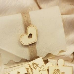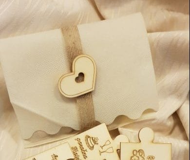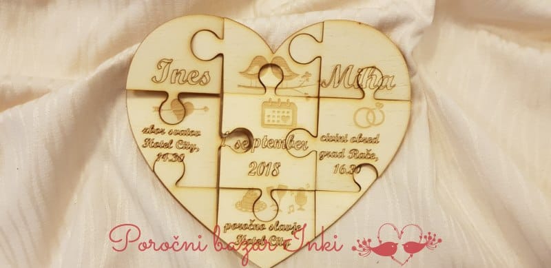 Lesena vabila v obliki puzzlov – srček je narejeno iz 9 kosov. V ceni je kuverta v katero se dajo koščki, ob doplačilu 0,30 eur pa lahko puzzle zapakiramo v posebno vrečico, z dekoracijo. Za več informacij nam pišite na info@porocni-bazar.si