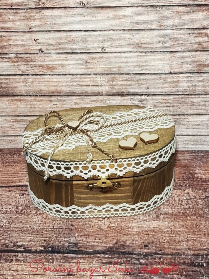 Ob doplačilu lahko škatlice tudi graviramo, če želite gravuro, nam pošljite povpraševanje, da se dogovorimo o možnih izvedbah. Lahko pa se v notranjosti doda kartonček, na katerega napišemo vajini imeni in datum, izgleda kot gravura.