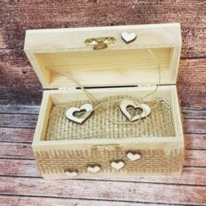Ob doplačilu lahko škatlice tudi graviramo, če želite gravuro, nam pošljite povpraševanje, da se dogovorimo o možnih izvedbah. Lahko pa se v notranjosti doda kartonček, na katerega napišemo vajini imeni in datum, izgleda kot gravura.