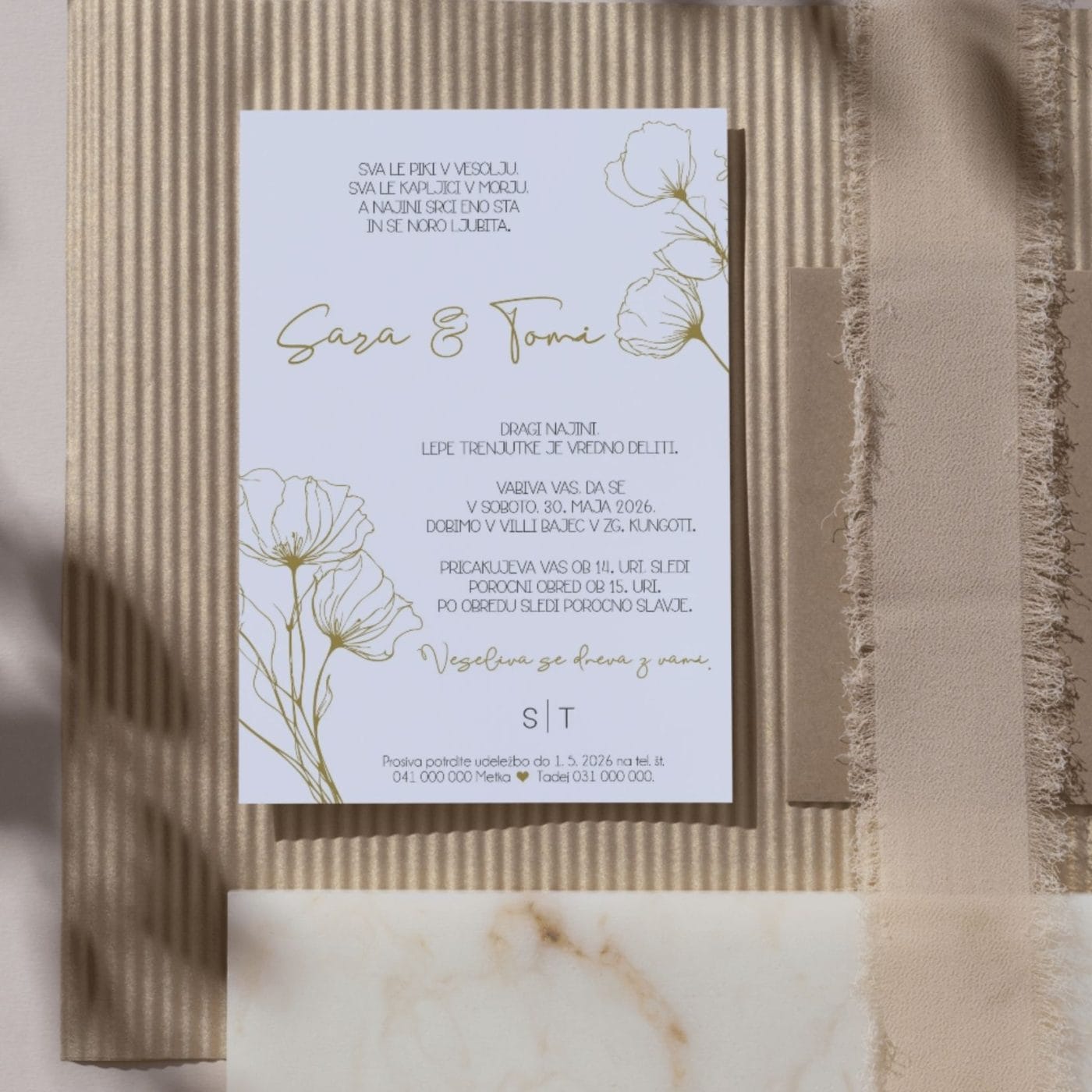 Takšna poročna vabila ne potrebujejo bogatih okraskov – njihova moč je v ravnovesju med obliko, barvo in besedo.