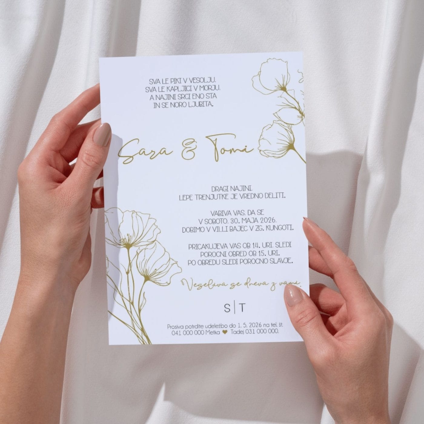 Minimalistično poročno vabilo z nežnimi cvetovi – čiste linije navdušuje s svojo preprostostjo, umirjenimi barvami in elegantnim dizajnom. Vabilo je enostransko tiskano na kakovosten bel perl papir gramature 290 g, ki mu daje nežen sijaj in prefinjen videz.