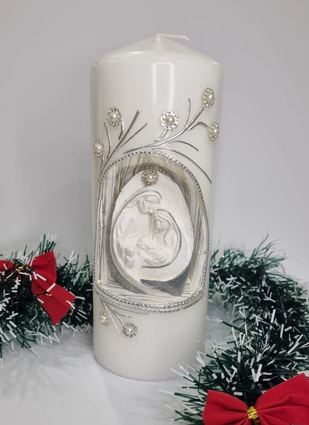 Praznična sveča s keramično figurico Svete družine – ročno izdelana umetnina za vaš dom