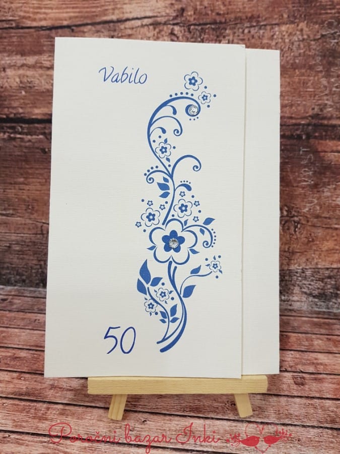 Sodobno oblikovano vabilo za Abrahama z modrim elegantnim cvetličnim motivom, ki izstopa s svojo preprostostjo in elegantnimi detajli. Namenjeno je vsem, ki želijo praznovanje 50. rojstnega dne predstaviti na moderen, a še vedno prefinjen način.