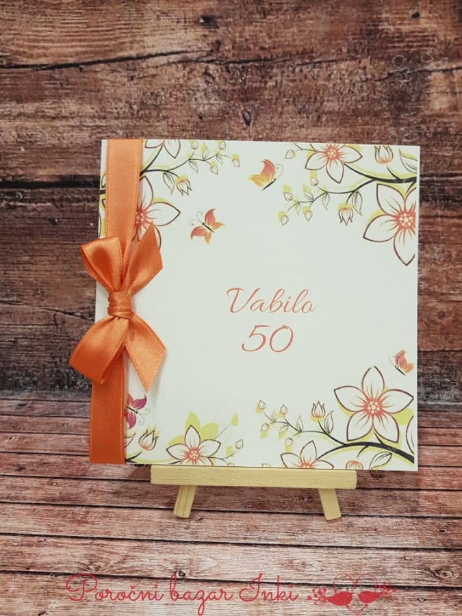 Vsako praznovanje Abrahama je edinstveno – takšno je tudi to vabilo z oranžno pentljo, rožicami in metuljčki. Z možnostjo personalizacije in skrbno dodelanimi detajli ustvarja posebno izkušnjo že ob prejemu vabila. Primerno za vse, ki želijo nekaj več kot le klasično povabilo.