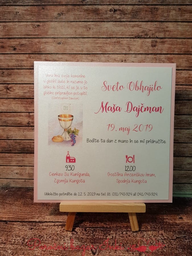 Vabilo za obhajilo z roza pisavo in kelihom Vabilo za obhajilo na roza pap...