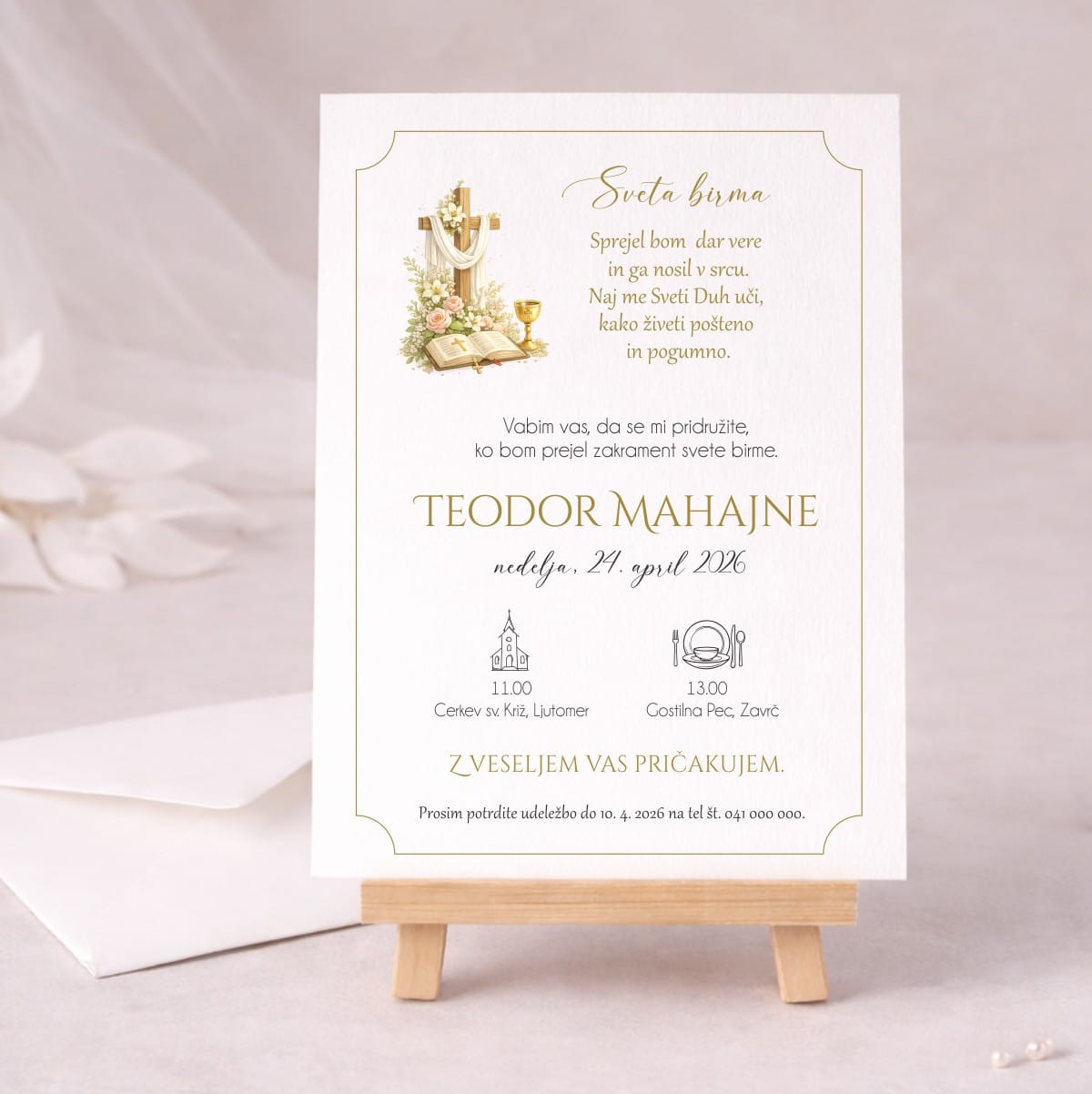 Vabilo za birmo z nežno simboliko in premišljenim dizajnom je lepo povabilo, s katerim boste svoje najbližje povabili k praznovanju tega posebnega dne.