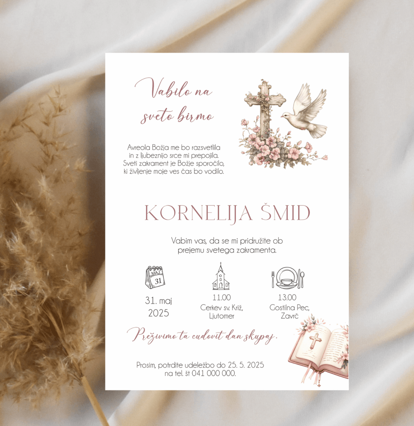 Vabilo za birmo z nežno simboliko in premišljenim dizajnom je lepo povabilo, s katerim boste svoje najbližje povabili k praznovanju tega posebnega dne. Vabilo za birmo z rožicami, križcem, biblijo in golobčkom je preprosto a elegantno.