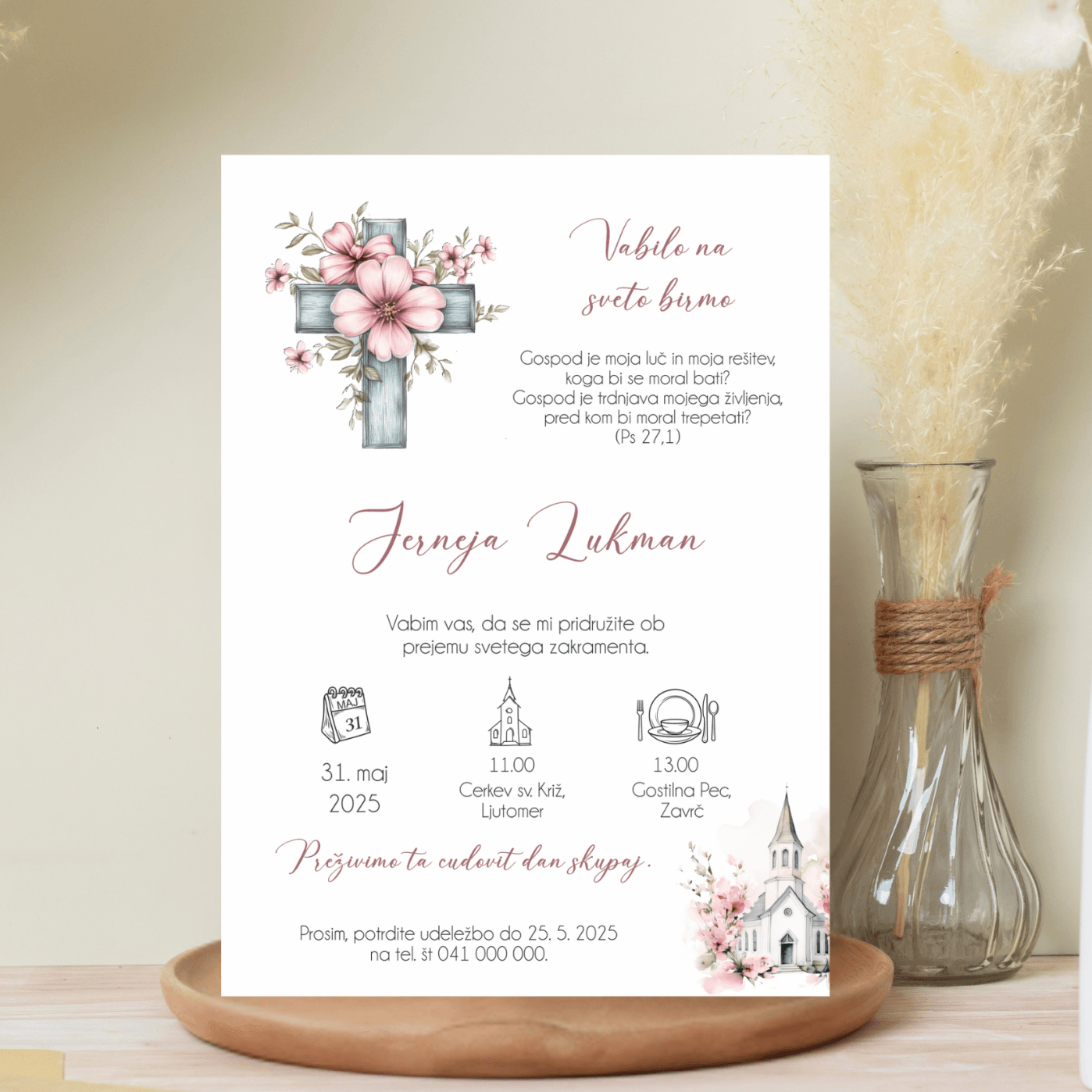 Vabilo za birmo z rožicami in križcem predstavlja nežno simboliko in premišljenim dizajnom je lepo povabilo, s katerim boste svoje najbližje povabili k praznovanju tega posebnega dne.